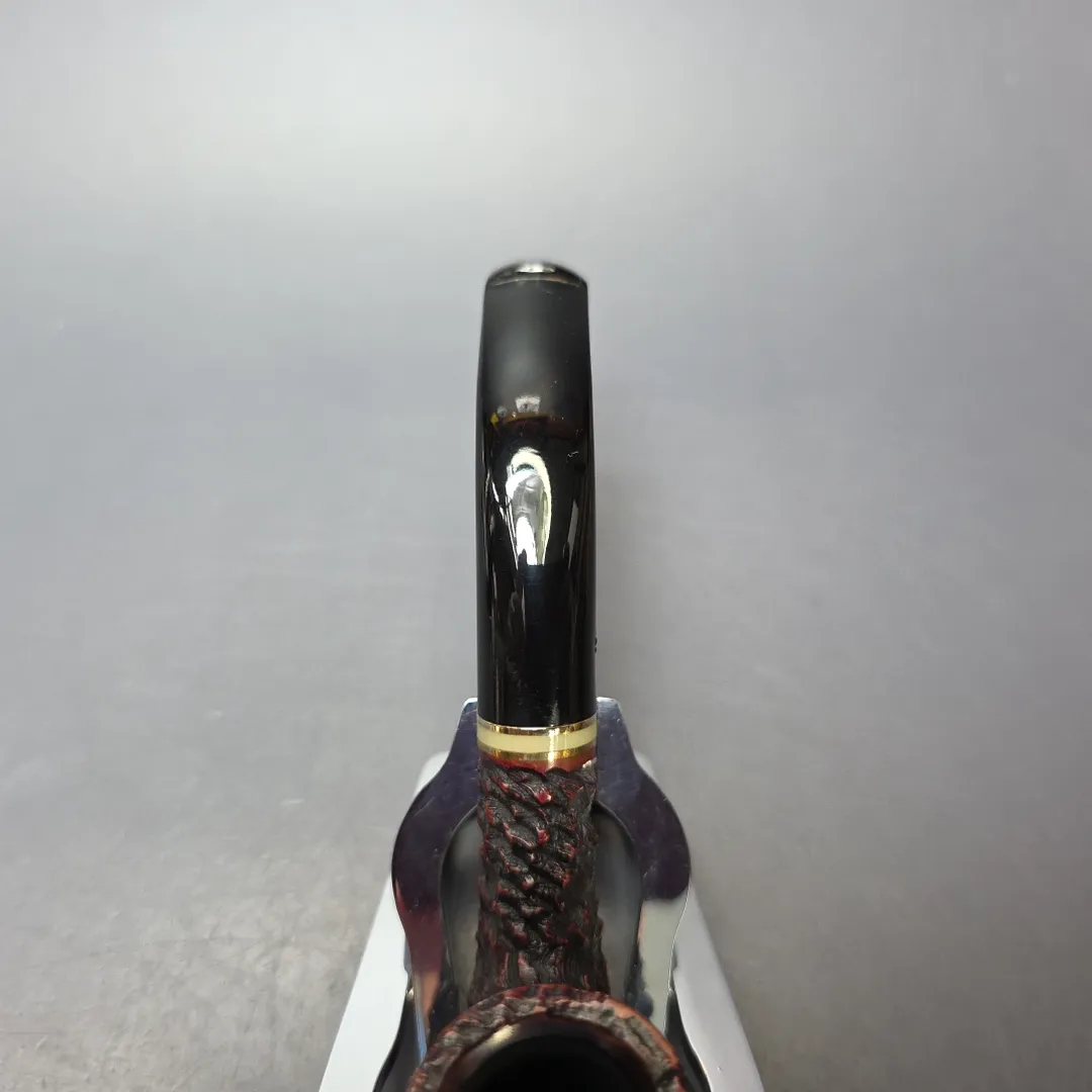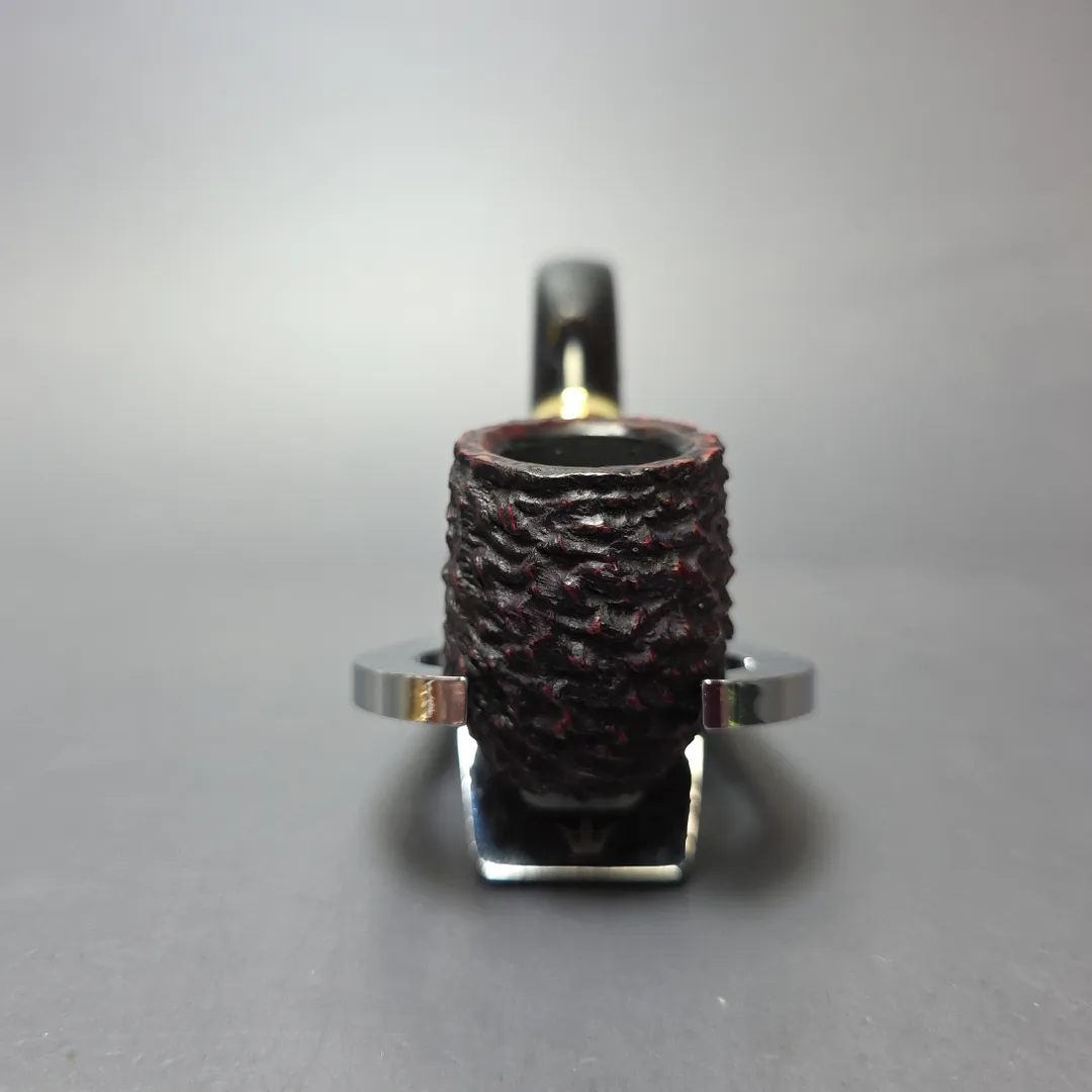 As far as I’ve read, the Peterson’s Emerald series debuted in the late-1980s, though like with many Peterson series, it has changed over the decades. This looks to be an older one, especially judging by the nomenclature. It features what Mark Irwin at Peterson Pipe Notes refers to as a “pebble grain” rustication, which was typical of the first iteration of the Emerald, rather than the scooped finish seen on the contemporary one. Eagle-eyed viewers will also note that the namesake “emerald” band sandwiched between two brass ones at the end of the shank is not green, but has faded to more of an ivory or abalone hue. This is something that commonly happened to the accent material in the original Emerald pipes, though, and as I’ve said before, I’m personally quite fond of it like that.
