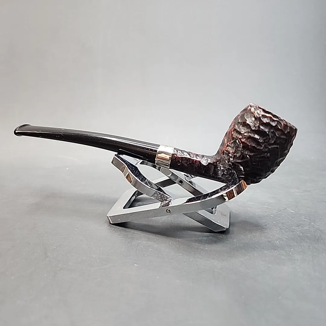 All the pipes of Peterson’s Junior line are united by their compact, diminutive proportions and classic shaping, offering profiles that nod to early 20th-century pipe design. This Belge model, featuring a plump, forward-canted bowl set to a subtly bent shank-and-stem arrangement, is finished in Peterson’s signature rustication and topped with a broad band of bright nickel.