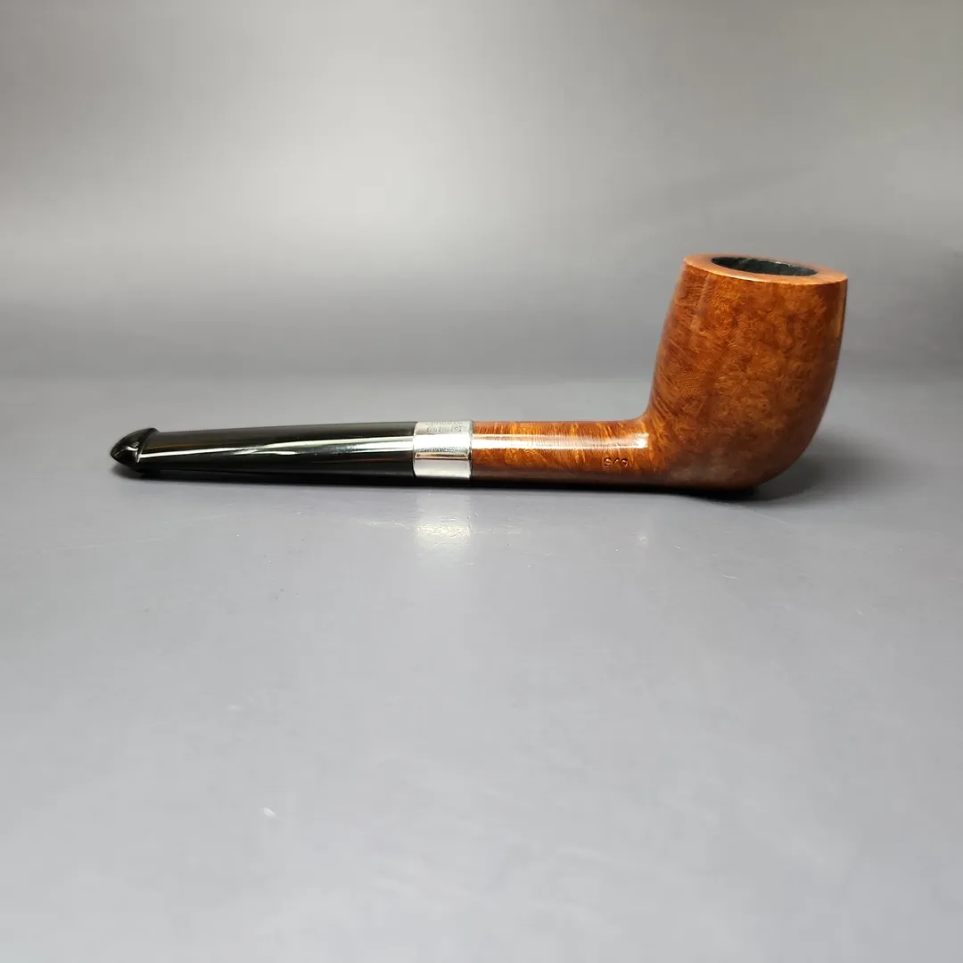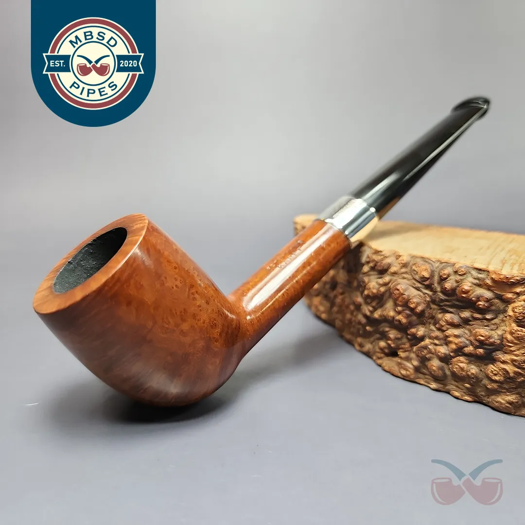 Debuting around 1925, Peterson’s Kapet has a good deal of history behind it, though has had a habit of disappearing and reappearing, and doing so in rather different guises. It has been described, such as by Peterson historian Mark Irwin, as “entry level” pipe as far as grade goes, though the various historical iterations of the Kapet, along with the various finishes and accoutrements that accompanied them, are worth pointing out. Very early Kapets, for example, wore a smooth plum finish and were touted as being made from especially old briar; more recently, they were reissued in a tree bark rustication, though those too are, seemingly, no longer in production. This Kapet, on the other hand, is a little different to either. Based on the block-letter “Made in Ireland” nomenclature, this one was made in the 1940s, prior to the formation of the Irish Republic as it exists today. The finish is a natural variant, and the pipe is mounted with Peterson’s signature sterling silverware (sans a date letter, as was standard during the time). Perhaps most interesting about this Kapet is the shape: the “949” oval shank billiard which, again per Irwin, hasn’t been in production since the 1940s—the very same decade this pipe was made.