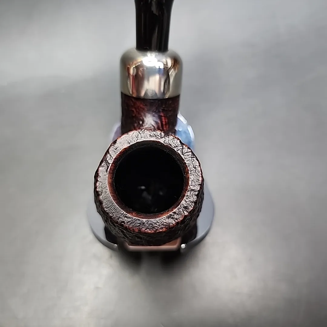 Speaking of Peterson’s System, this pipe is an example of exactly that. What looks like a simple, bent billiard hides within its shank a reservoir for collecting moisture produced during the smoke. This one is an example of Peterson’s “307” bent billiard, one of the largest shapes offered for System pipes. This 307 wears Peterson’s Standard sandblast finish.