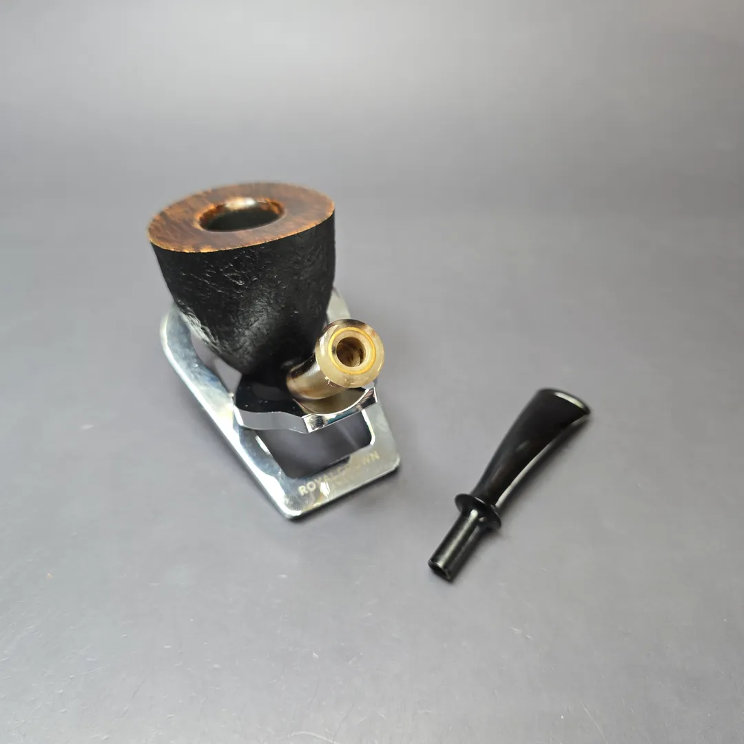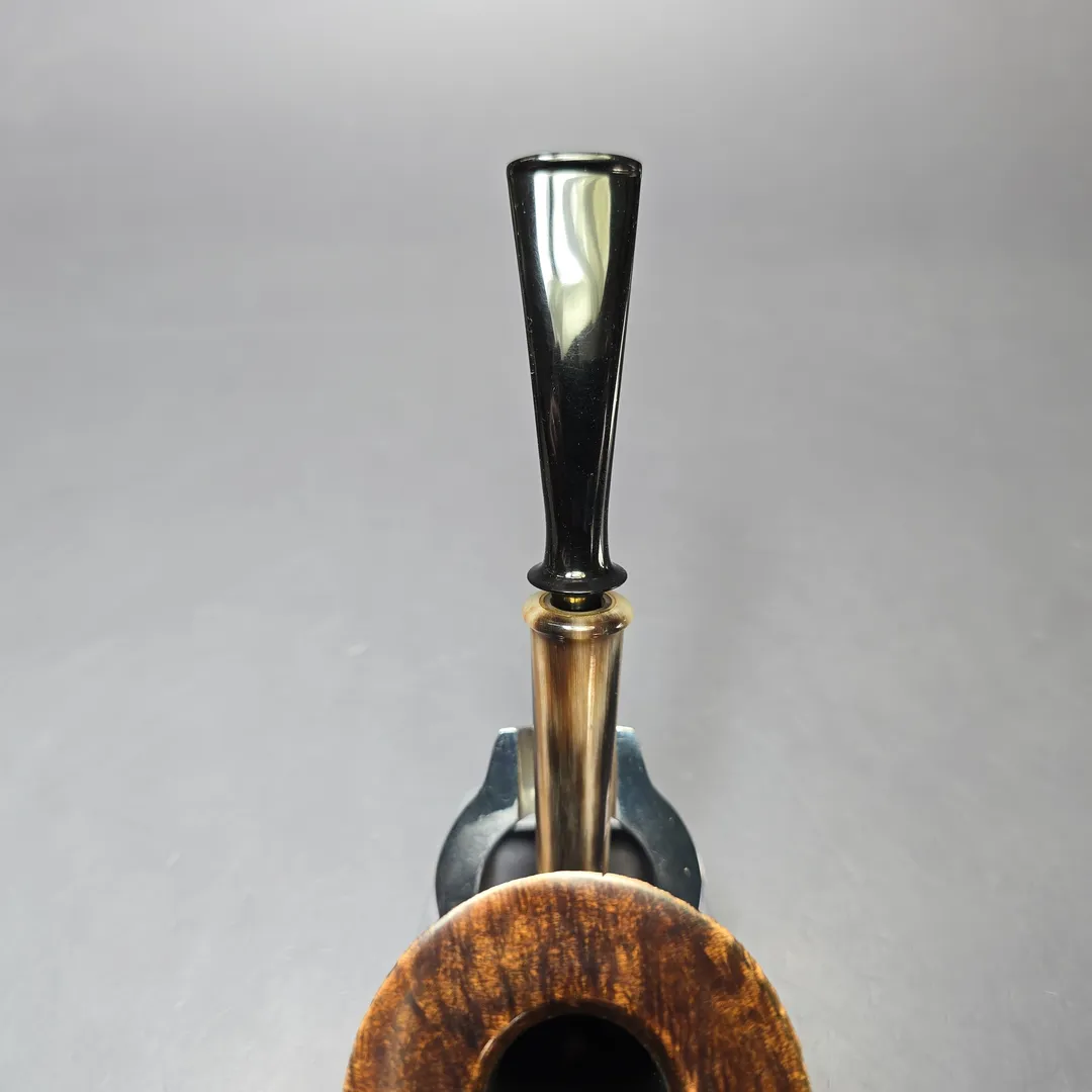 The Dublin Pickaxe was one of Piero Vitale’s first signature shapes, and indeed one that would, for a time, be licensed to one of his Italian factory partnerships. This one, however, comes from his own hands, incorporating shaping cues and features not possible in a factory make. Distinguished by a graceful, downward bend from its mouthpiece through its long, pencil-thin, horn shank extension, the design sharply rises at the base of the shank, giving the pipe its hallmark “pickaxe” profile. From here, the bowl bursts out into a surprisingly organic figure, resulting in an almost floral appearance when considering the design as a whole. Two Star grade.