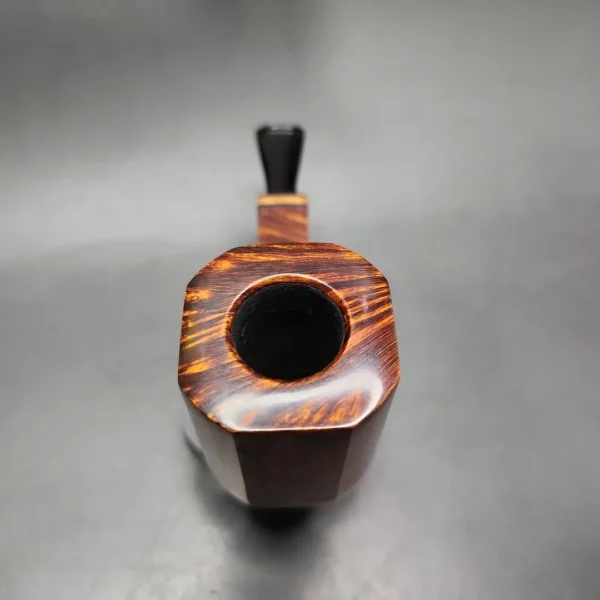 I’ve been following Piero Vitale’s work for many years, so I was very excited when we got to meet him in person at the Las Vegas pipe show in early October. I was even more excited when we arranged to stock some of his pipes at MBSD. As with the other Vitale pipes we selected, this one seemed like a perfect addition and introduction to his style. It is a Moon grade panel billiard, but it’s not like any foursquare you’re likely to have seen before. Embodying Vitale’s unique aesthetic, it is generally quite compact, save for its towering, stack bowl. Owing to its panels, it has an almost architectural quality, like a bastion perched atop a castle wall. Of course, being briar rather than stone, this formidable design is covered in rich bird’s-eye patterns interspersed with cross-grain.
