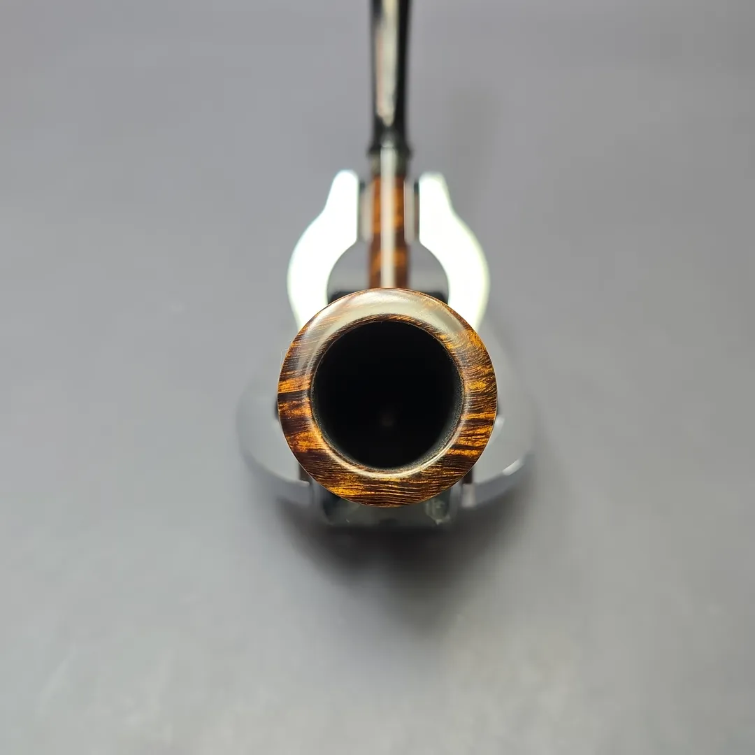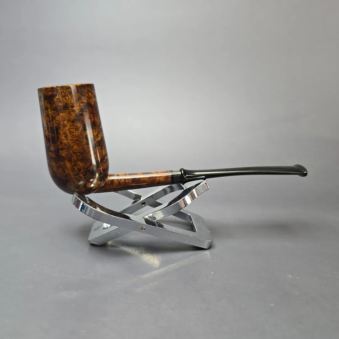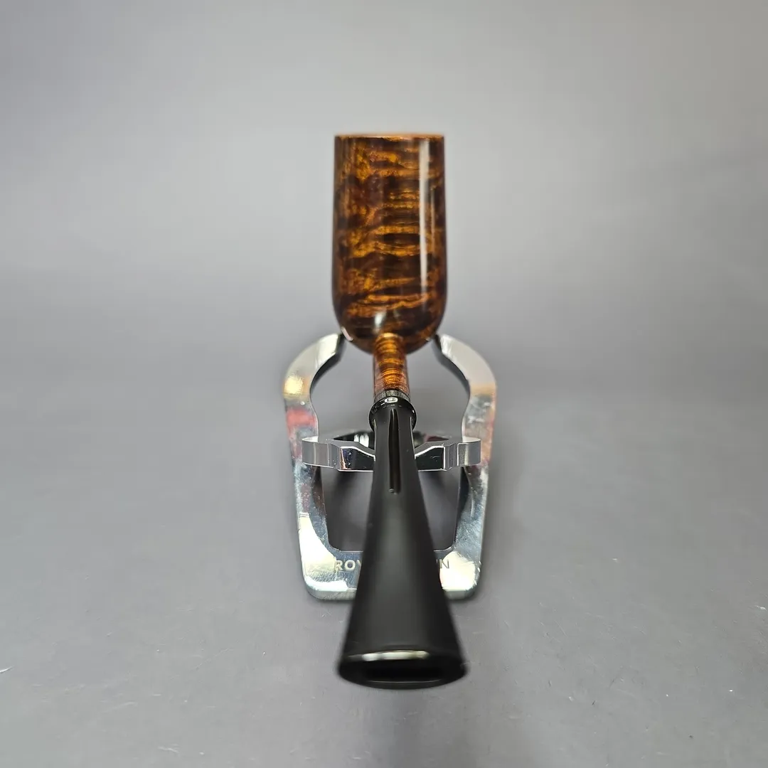 “Pencil-shanks” and other distinctly narrow design elements are hallmarks of many of Piero Vitale’s signature shapes, and nowhere are these elements more prominent than Vitale’s signature “Chimney,” Defined by its pencil-thin, ebonite and stainless steel-stabilized shank, long, slender mouthpiece, and tall, stacked billiard bowl, its slight aesthetic is matched by an almost impossible lightness in weight. This golden-contrast finished Chimney is a Moon grade, the second-highest possibly for a Vitale pipe.