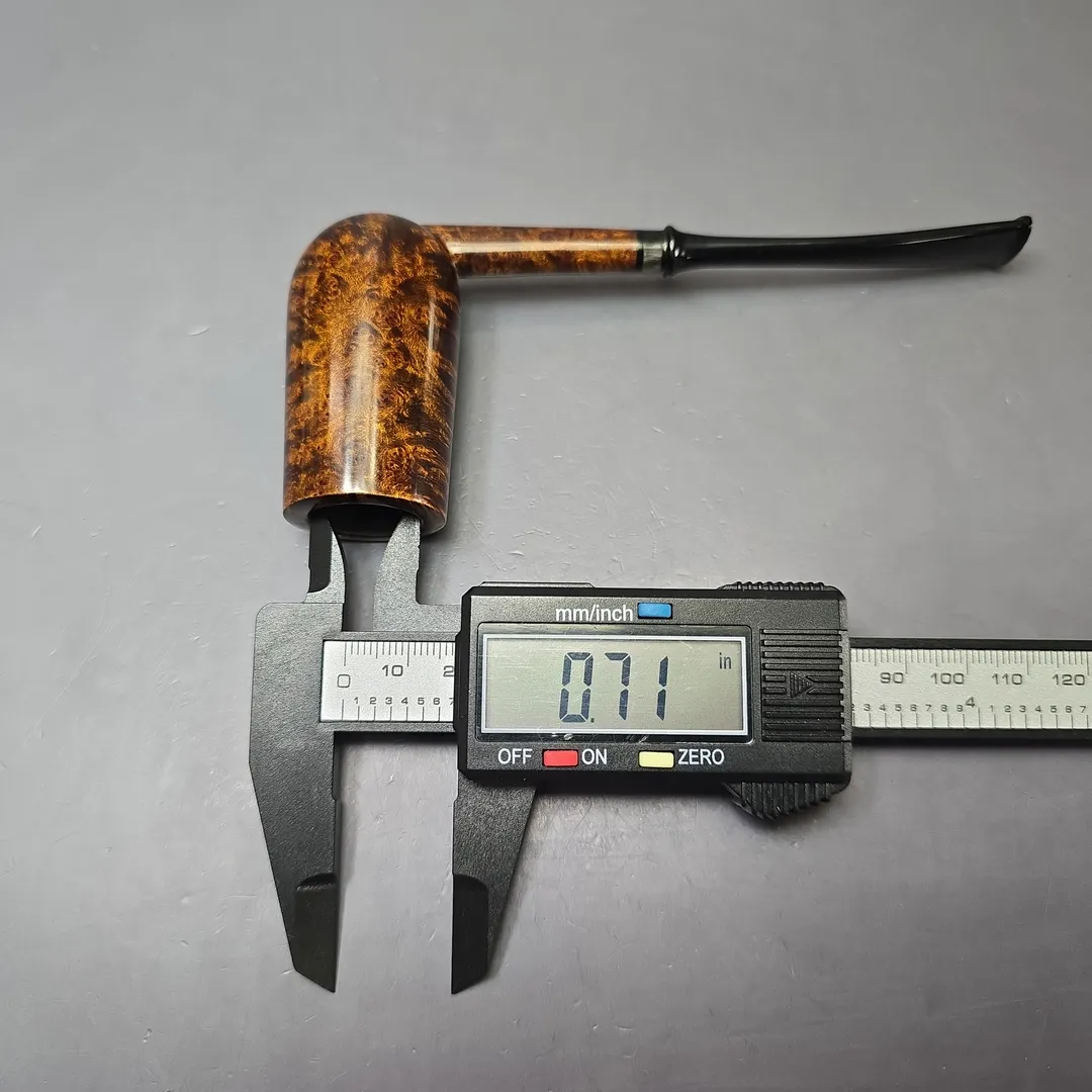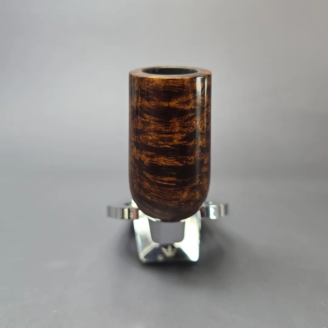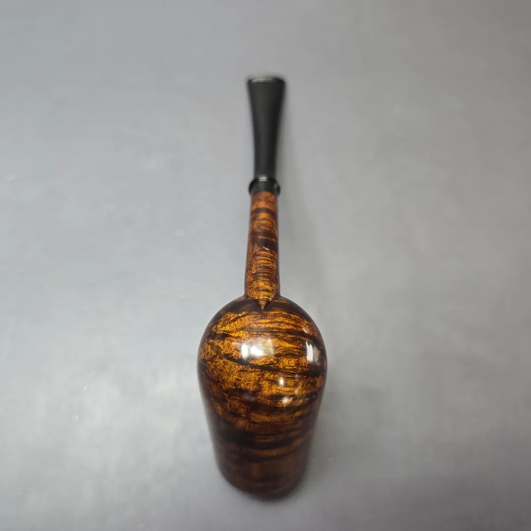 “Pencil-shanks” and other distinctly narrow design elements are hallmarks of many of Piero Vitale’s signature shapes, and nowhere are these elements more prominent than Vitale’s signature “Chimney,” Defined by its pencil-thin, ebonite and stainless steel-stabilized shank, long, slender mouthpiece, and tall, stacked billiard bowl, its slight aesthetic is matched by an almost impossible lightness in weight. This golden-contrast finished Chimney is a Moon grade, the second-highest possibly for a Vitale pipe.