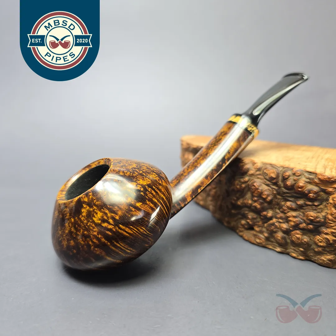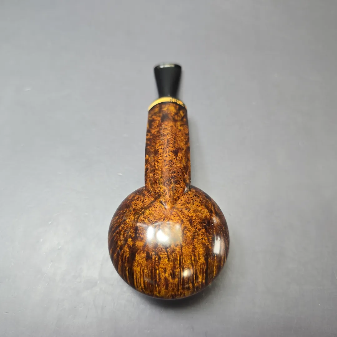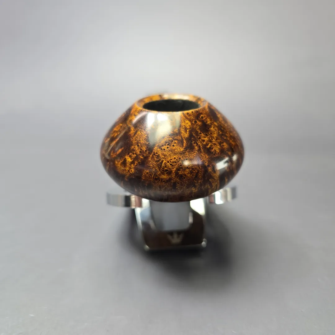 Vitale has a number of decidedly squat shapes in his portfolio, though none are perhaps more so than his signature squat tomato rendition. Closer to the Ukelele of Sixten Ivarsson than the Eskimo popularized by Tom Eltang, it’s a beautifully “ripe” figure, with its buxom bowl perched atop its shank like fruit on a vine. This one wears a striking golden contrast finish, paired perfectly with the black and tan tones of spalted tamarind. In Vitale’s grading system, this one earned a Moon grade, the second highest possible for a Vitale pipe.