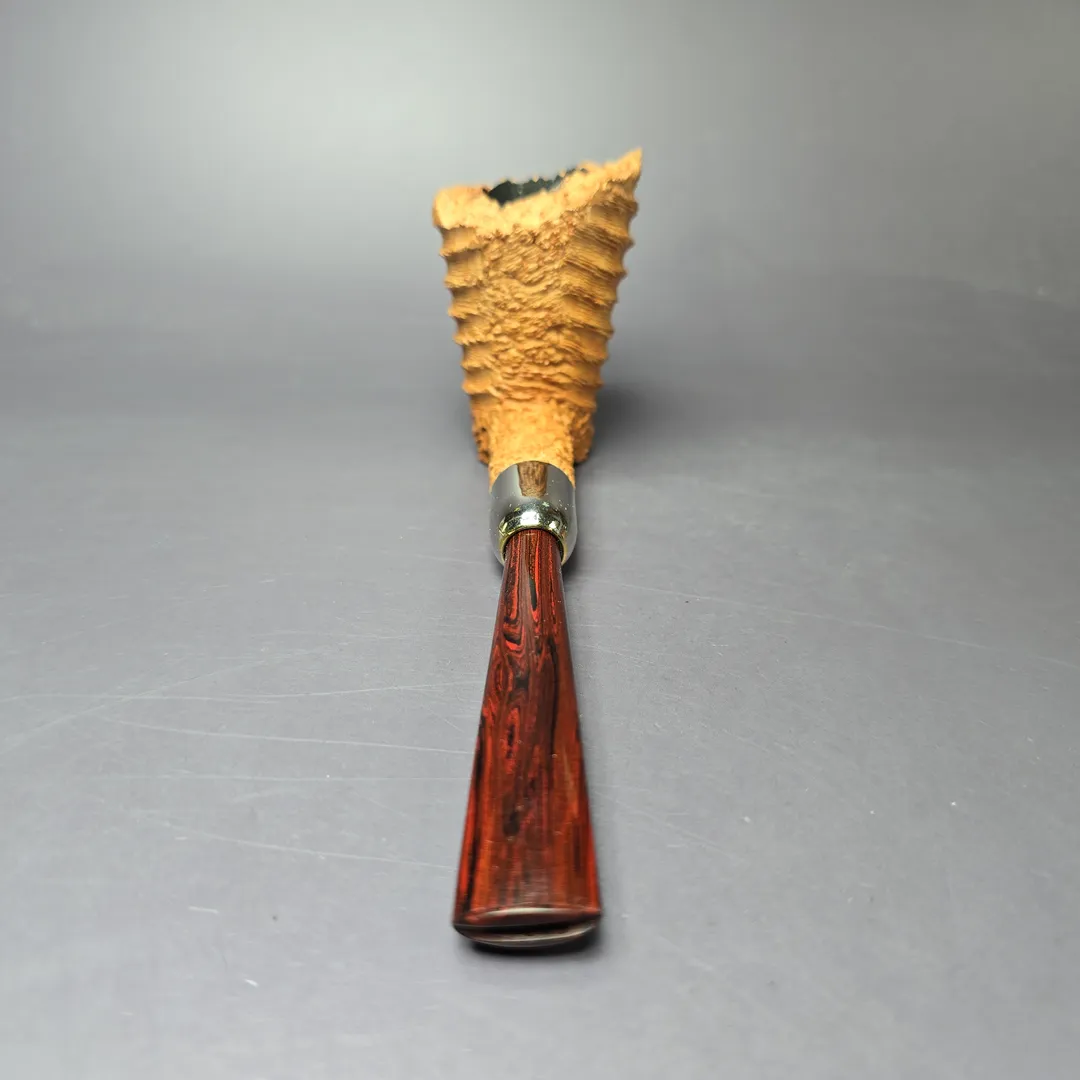 Tristan Lefebvre’s signature “Ammonite” finish finds its inspiration in the fossils of prehistoric marine life, whose grooves and contours he blends with planes of Italian-style pebble-dash rustication to a unique effect. That’s part of what I like about Tristan: he knows that there’s more to pipes than straight grain smooths and ring grain sandblasts (though he is highly adept with those finishes, too). Another thing I like is his precision, crafting pipes that are well balanced, that sit when they’re supposed to, and are flush where they are supposed to be. And last, but by no means least, is his commitment to continual development of his range of skills, with this particular, plateaux top Dublin featuring a sterling silver army mount turned by Tristan himself, after spending months learning to do his own silversmithing.