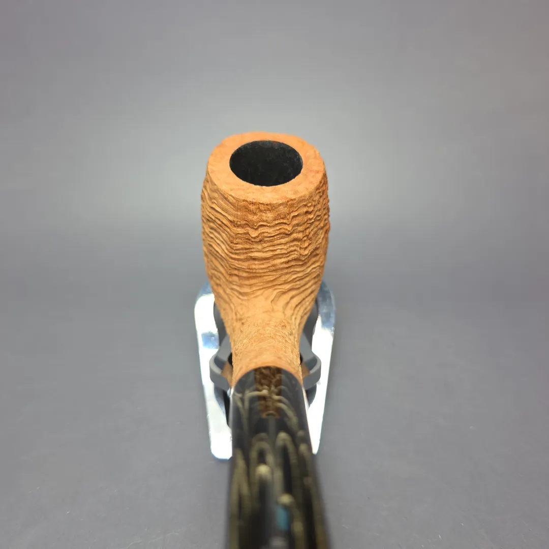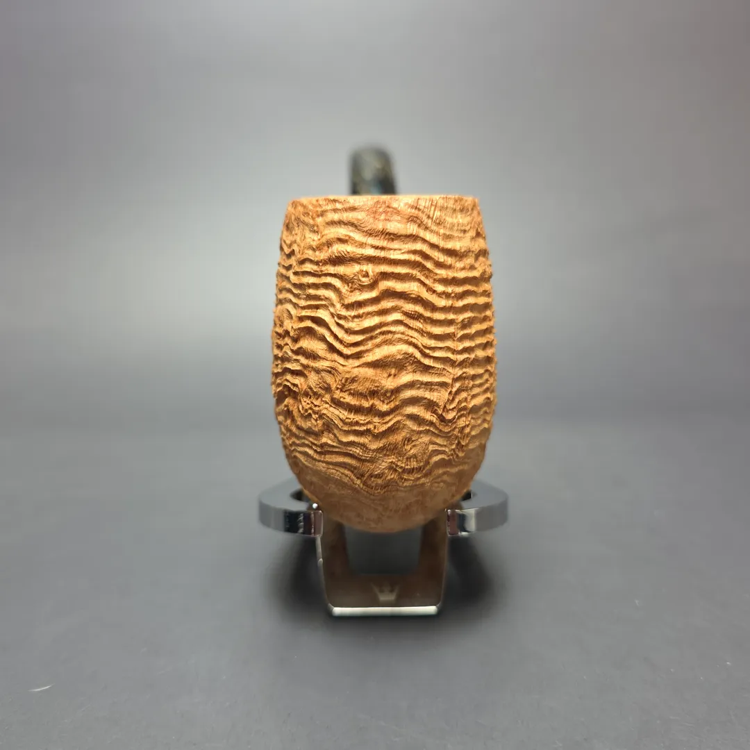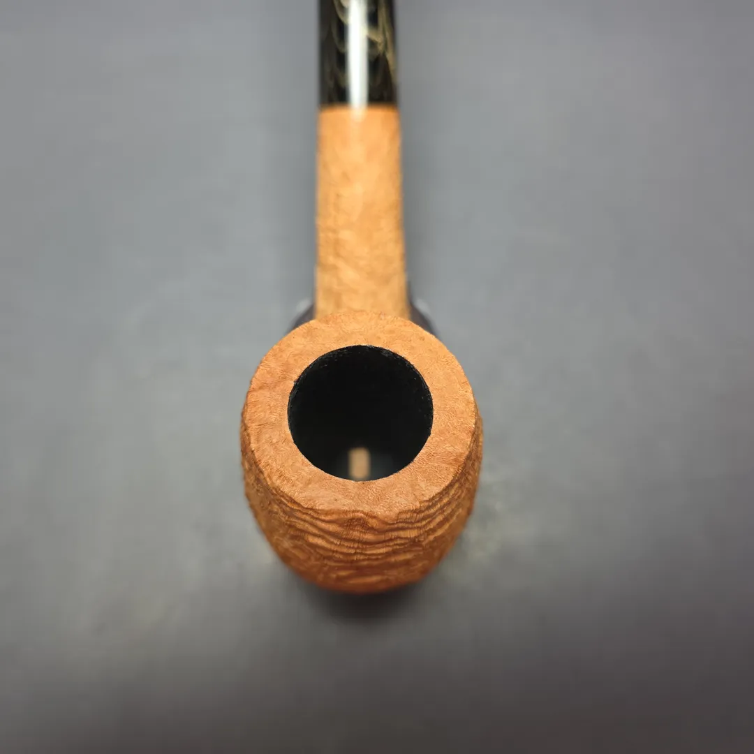 In this latest batch of pipes for us, Tristan Lefebvre continues to demonstrate his mastery of the form. In the case of this one, it’s by way of a magnum—or, at the very least, a mini-magnum—LC rendition, faithful to the shaping conventions of Dunhill’s 1920s variations. This one has also been dressed in a simple, natural sandblast that bears all as regards its tight, extraordinarily craggy ring grain.