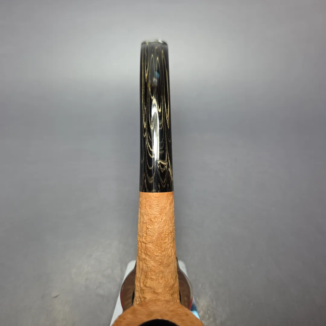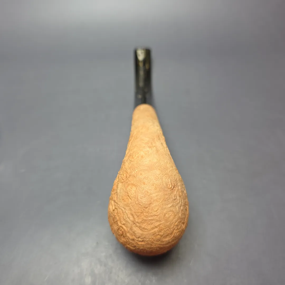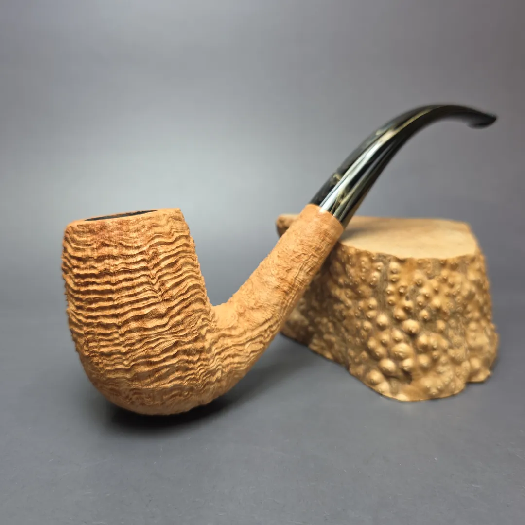 In this latest batch of pipes for us, Tristan Lefebvre continues to demonstrate his mastery of the form. In the case of this one, it’s by way of a magnum—or, at the very least, a mini-magnum—LC rendition, faithful to the shaping conventions of Dunhill’s 1920s variations. This one has also been dressed in a simple, natural sandblast that bears all as regards its tight, extraordinarily craggy ring grain.
