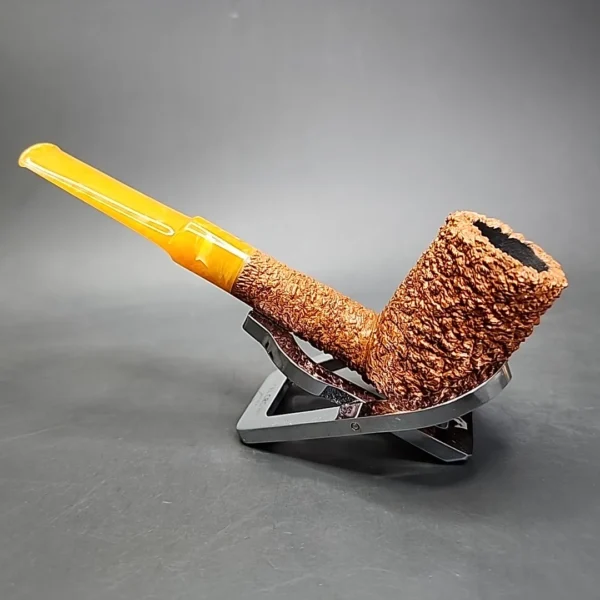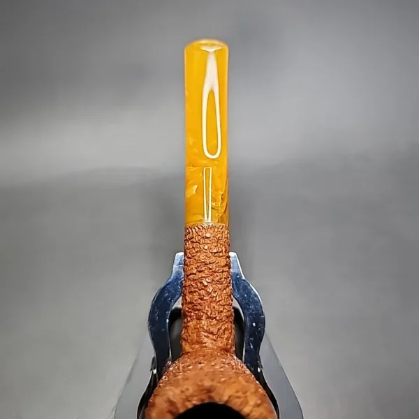 With Tristan’s latest batch of pipes, I’ve noticed an inclination toward classic pipe shapes. This one certainly has an old-world quality to it, though with a twist of Tristan’s own making. It is more or less a simple saddle billiard, with smaller, pocket friendly proportions, a slightly forward-canted bowl, and an imitation amber stem. In other words, it is very much reminiscent of early, turn of the century briar pipe design. Tristan’s modern addition to the design, however, is his signature Granite rustication, which is more in keeping with the pebble-dash finishes of the great post-war Italian workshops.