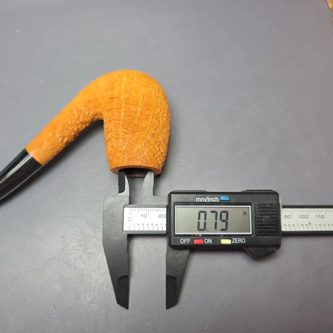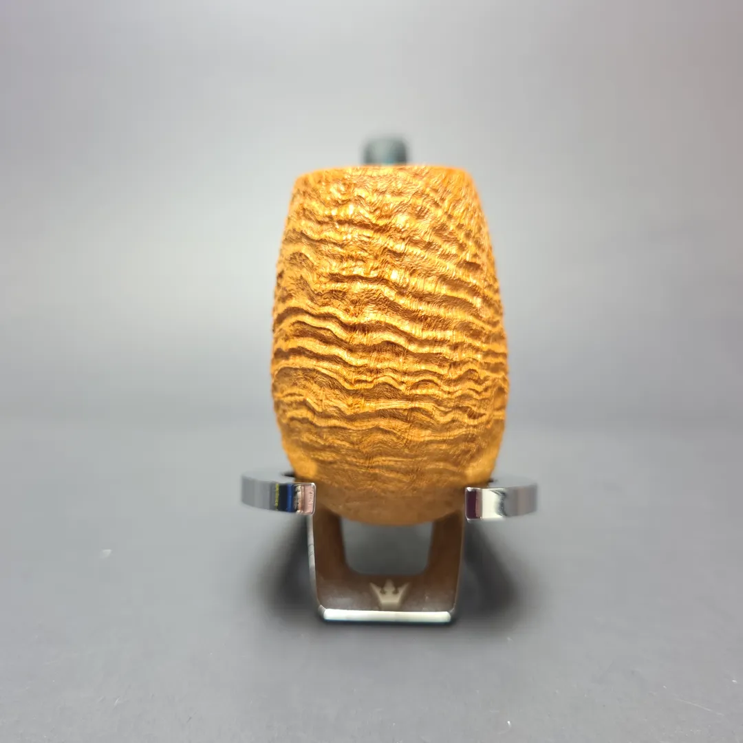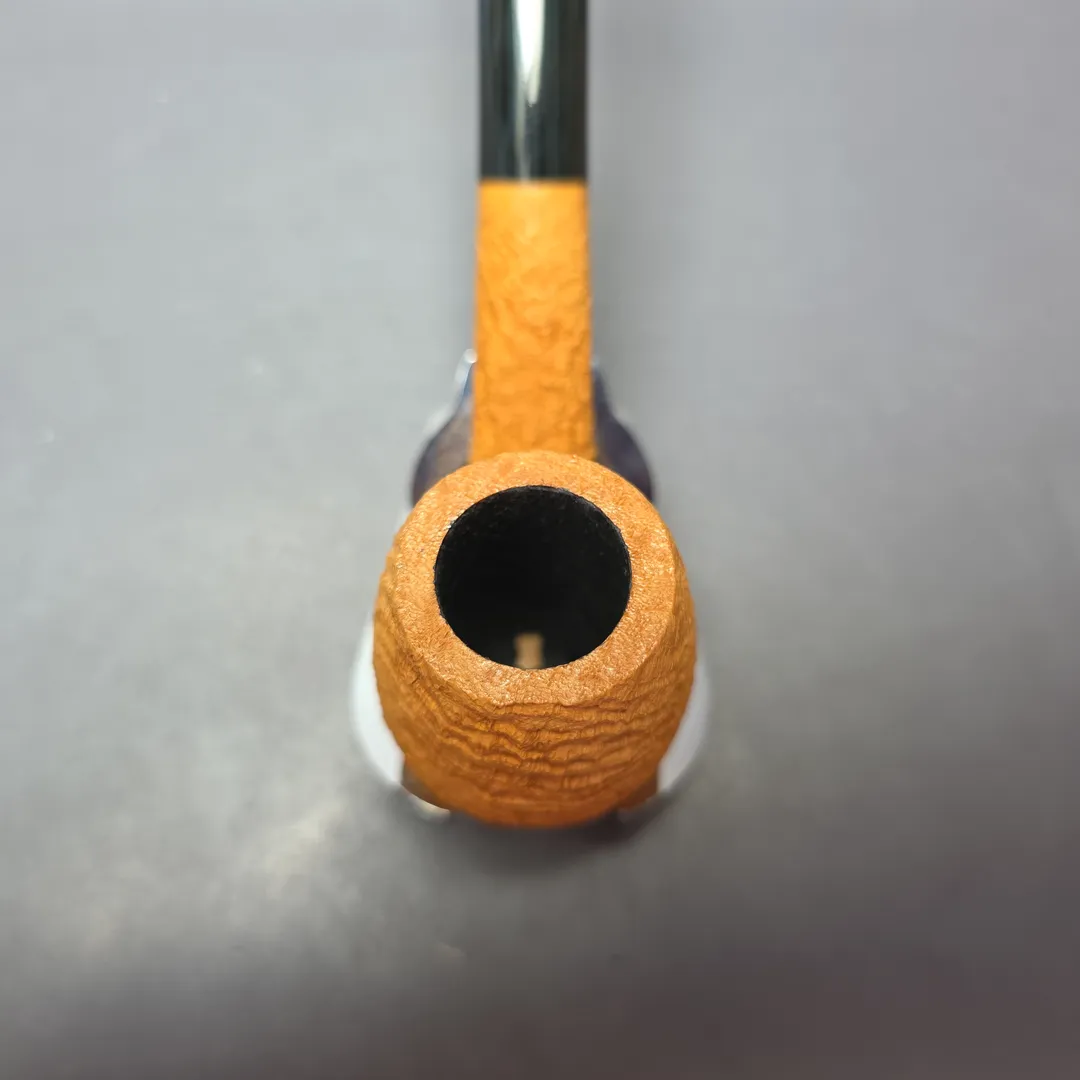 In this latest batch of pipes for us, Tristan Lefebvre continues to demonstrate his mastery of the form. This one, for example, pays homage to the curious subset of interwar Dunhill pipes that have come to be known—thanks to the late Dunhill historian John Loring—as the “120LC,” or “120 LC.” These were nominally Dunhill 120 shapes but, for some reason, they were closer to the shaping conventions of the LC, but not quite as large. It was, however, still a large pipe, with this one following suit. The latter is also dressed in a light, Tanshell-esque sandblast, showing off copious, dense ring grain, which Lefebvre has paired with a hand-cut, blue cumberland mouthpiece.