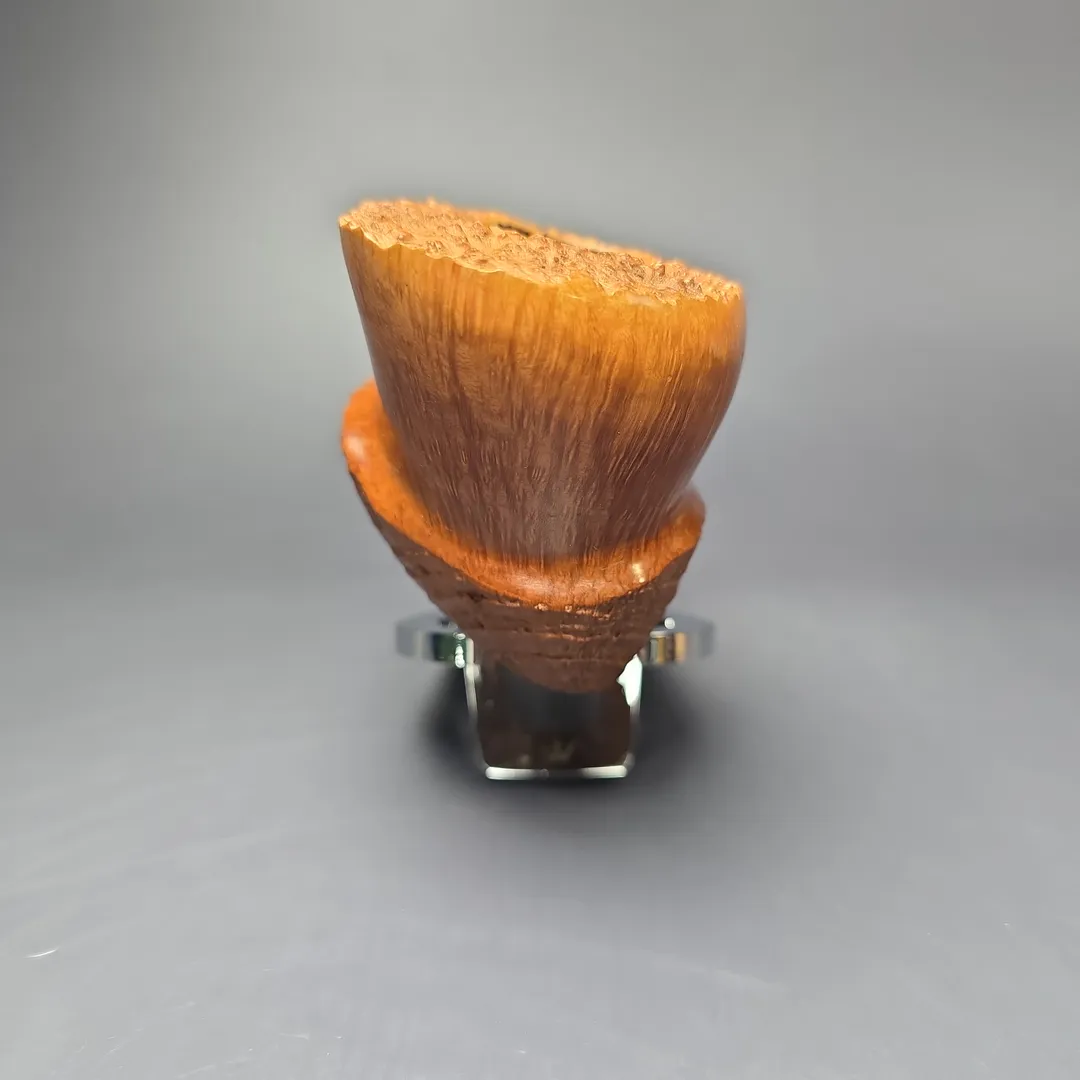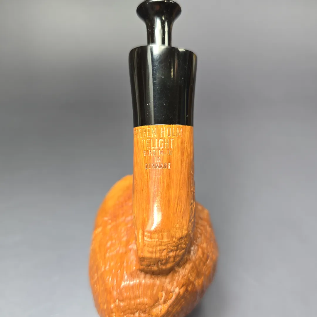 This particular Preben Holm belongs to his “Delight” series, which showcased Holm and his apprentices’ masterful ability to blend different finishes in the same design. This one is particularly beautiful in that composition, with the bowl’s tan sandblasted sections resembling something of a platform upon which the smooth sections emerge. One could liken it to an avant-garde (think Picasso, or Dali perhaps) rendition of the old Charatan “cup and saucer,” or simply as the calyx and petals of a floral blossom. As should be expected of Holm, the sandblasting is crisp and highlights ring grain, while the remainder of the bowl is lit up with remarkably fine and consistent flame grain, culminating in a particularly vibrant rim of plateaux burl.