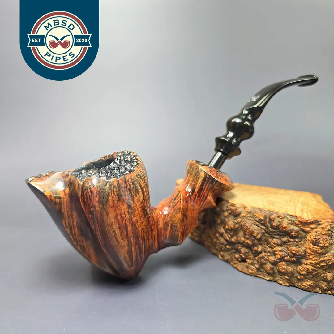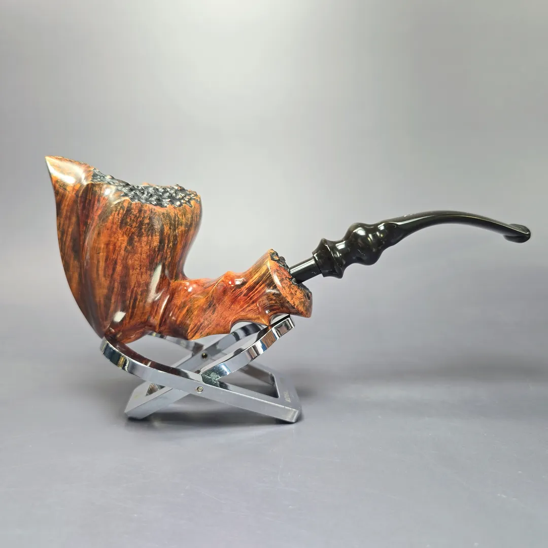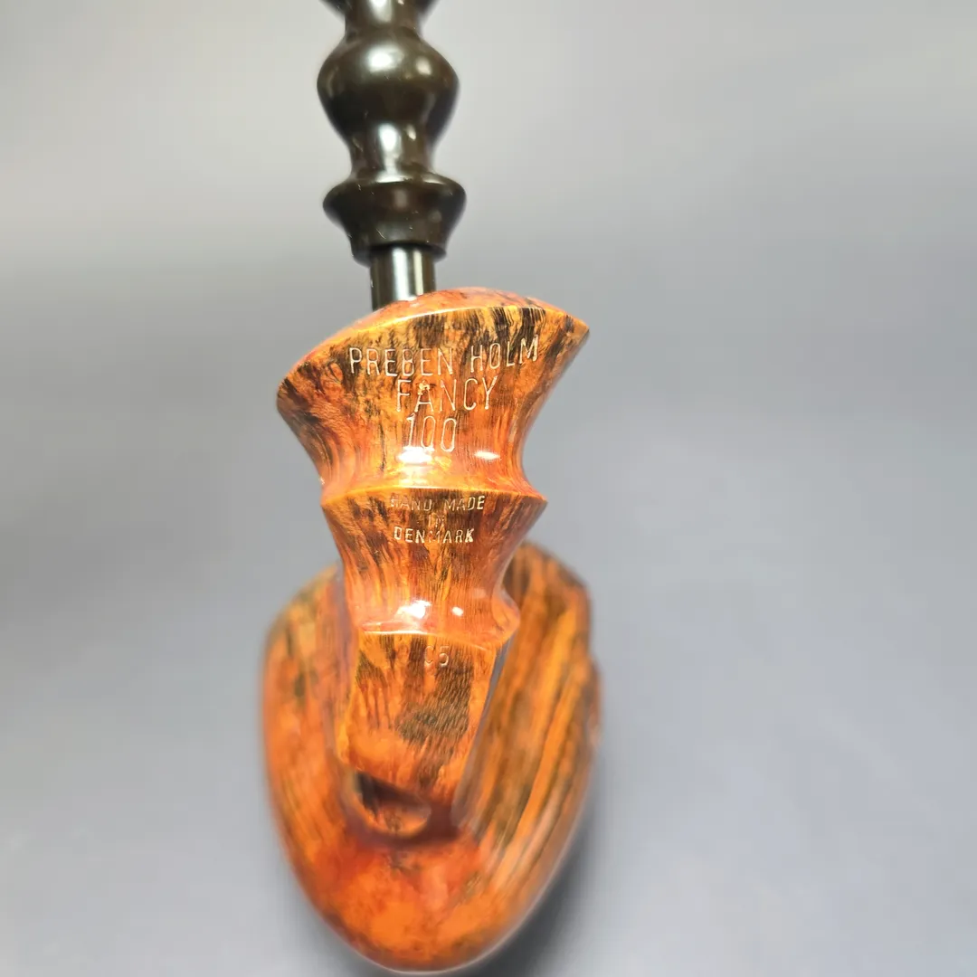 One of the names originally associated with the Scandinavian freehand movement was the “fancy,” or the “Danish fancy.” This term was largely used to denote pipes that we today would simply call “freehands,” not unlike the Nording Freehand lines that dominate the genre today, though not exclusively. Additionally, the word “fancy” did not first arise from the Danish language but was a borrowing from English, particularly as a descriptor of something “modern.” Early catalogs from workshops like WO Larsen, for example, separated their most unconventional shapes from their regular (though still very “Danish”) shapes by referring to the former as “Fancy.” The notion of the Danish Fancy evolved over time, becoming more synonymous with the contemporary “freehand,” likely in part to the sheer force Preben Holm’s name carried in Danish pipe making. For example, this Fancy 100 grade is exemplary of the genre, featuring its signature plateaux burl rim, Holm’s expert use of furls and furrows, and, of course, lavishings of contrast-lit flame grain.