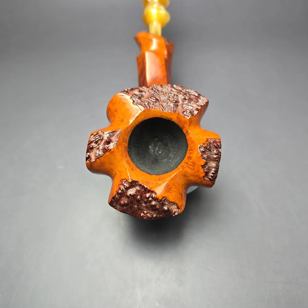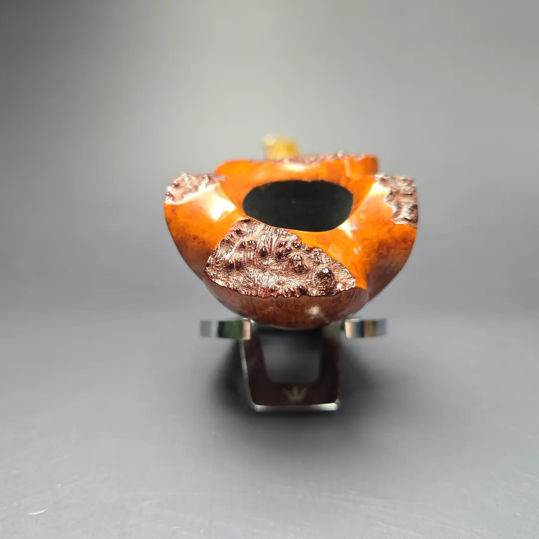It belongs to his “Fancy” series, a name that requires a little bit of context. One of the names originally associated with the Scandinavian freehand movement was the “fancy,” or the “Danish fancy.” This term was largely used to denote pipes that we today would simply call “freehands,” not unlike the Nording Freehand lines that dominate the genre today, though not exclusively. Additionally, the word “fancy” did not first arise from the Danish language but was a borrowing from English, particularly as a descriptor of something “modern.” Early catalogs from workshops like WO Larsen, for example, separated their most unconventional shapes from their regular (though still very “Danish”) shapes by referring to the former as “Fancy.” The notion of the Danish Fancy evolved over time, becoming more synonymous with the contemporary “freehand,” likely in part to the sheer force Preben Holm’s name carried in Danish pipe making.