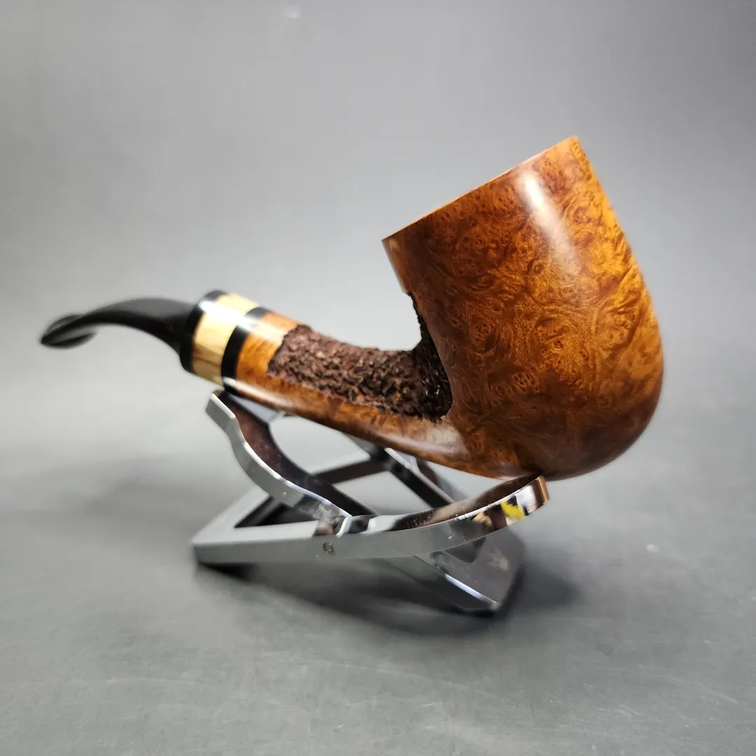 While a relatively conventional, compact bent billiard in shape, this pipe from Kentucky’s Preston Rogers features a rather unconventional mixed finish approach through the use of partial rustication on its left side. It gives the pipe a distinct quality reminiscent of the mythological Janus or Stevenson’s Jekyll and Hyde, while also being a joy to wrap one’s fingers around. The design is completed by a hand cut ebonite stem and a ring of spalted tamarind wood.
