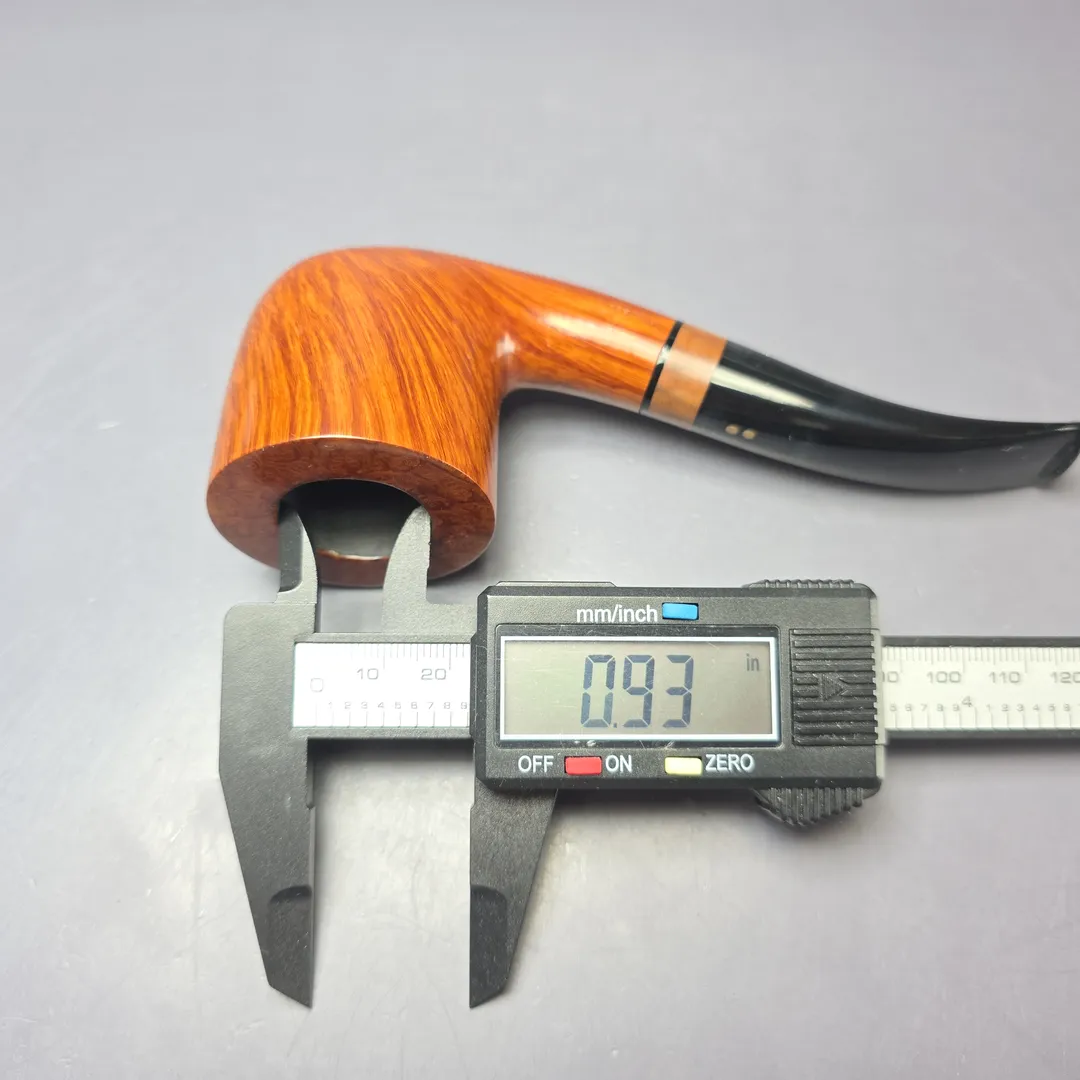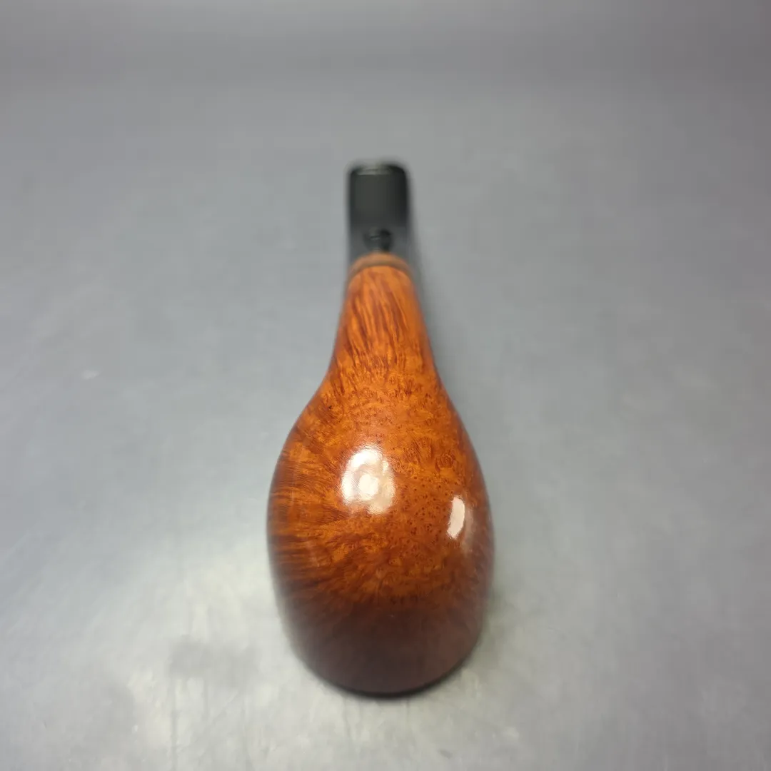 Radice’s Clear line is comprised of pipes with excellent grain, over which is laid a light blonde stain that allows this grain to express itself as clear as day. One step up from the Clear, however, is the “Fiammata” grade, an Italian term synonymous with straight grain and flame grain and which is, as such exclusively awarded to pipes with such extraordinary patterning. On Radice pipes, this is denoted by an “F” stamp, with this bent billiard rendition being a striking—and most certainly deserving—example. “O,” on the other hand, denotes pipes with a little something extra by way of accents and accoutrements. In this instance, that something extra is an olivewood inlay at the base of the stem, which, in addition to looking very tasteful, softens the transition in color between the bowl’s fiery blonde finish and the pipe’s jet-black Lucite stem.