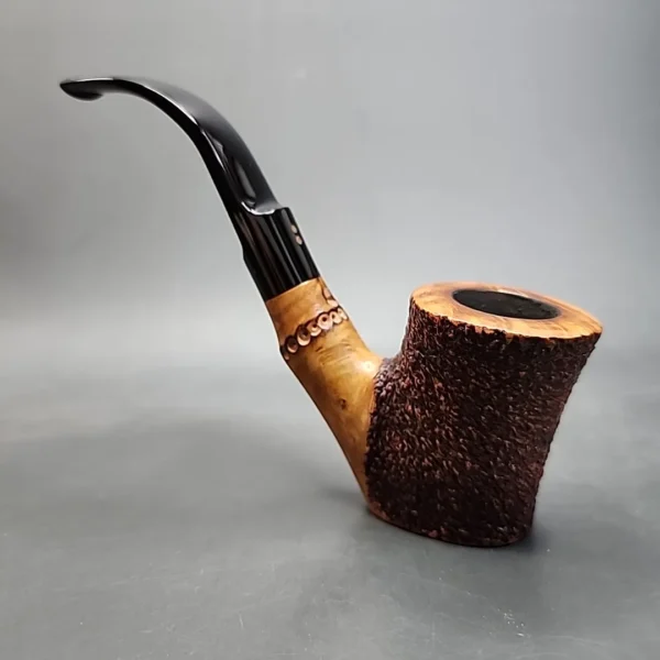 As with many Italian pipe-makers, Radice has its own, signature rustication style. Given Luigi Radice’s time working at Castello and Caminetto, one would presume that this would be a deep, rugged rustication, but the Rind finish is quite the opposite. While it is a similarly granular, pebble-dash approach to the Sea Rock Briar and Business finishes, the Rind is fine and shallow. In previous listings, I’ve wondered whether it was inspired not by stone formations but by citrus peel, hence the name. This Radice has something else that has become something of a signature for the make: a shank carved so as to resemble a bamboo extension. In the history of artifacts, this is known as skeuomorphism. It’s a fun concept. The shape is a kind of cherrywood, which could also be called skeuomorphic. I should really write something about pipe design and skeuomorphism sometime…