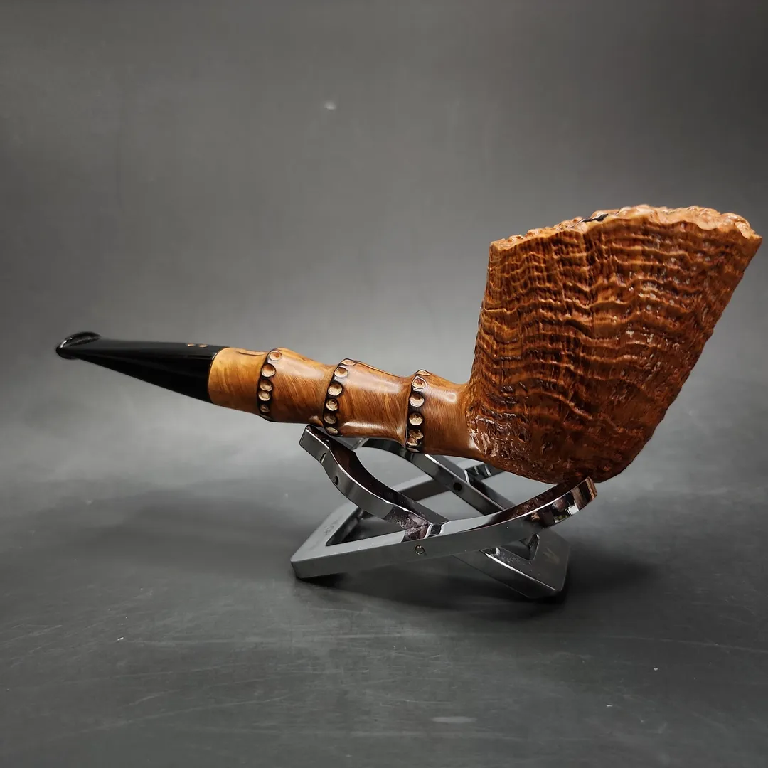 A spiritual successor to Caminetto’s Sable D’Or, Radice’s Silk Cut is the workshop’s signature sandblast finish. As is quite common in Italian pipes, these blasts are a little more shallow than their English and American counterparts, instead focusing on a consistent expression of the briar’s horizontal and vertical striations. The result is a texture that would certainly qualify as a ring grain finish, but also has a kind of “webbed” or “woven” character—not unlike its namesake fabric. This particular Silk Cut is an example of the workshop’s extra large “G” size grade, and also features another signature element—this time, specific to Radice—in the form of a shank whose briar has been hand worked to imitate the bamboo extensions of mid-century pipes (a subtle form of mimicry that, nevertheless, has its own name in broader art and design history: “skeuomorphism”).