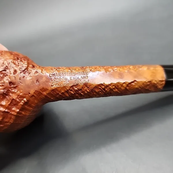 According to Ken Barnes, Charatan’s ‘Free Hand’ pipes were born in 1958, when Barry Jones carved a set of hand-shaped pipe so impressive, that then-owner Reuben Charatan immediately changed from his overalls into his suit and took the pipes down to Charatan’s London storefront. Judging by the nomenclature and design (including the absence of a Lane-era (£) symbol and double-comfort stem), this looks to be one of the very first Free Hand Charatans, from somewhere between 1958-1961. And what a Free Hand it is! While the shape is not as adventurous as some of the later hand-shaped Charatans, is is nonetheless a beautiful specimen. It is unconventionally large (Free Hand in the English sense was originally simply a deviation from established shape charts, performed by hand-turning techniques), and masterfully sandblasted in the Relief finish. This blasting has unearthed the kind of deep, craggy, uniform ring grain that would be emulated by later makers, such as America’s J.T. Cooke and England’s Bill Ashton Taylor. In fact, if I didn’t know the pipe was a Charatan, I might actually have thought it was one of Bill’s 1980s Old Church pipes.