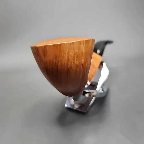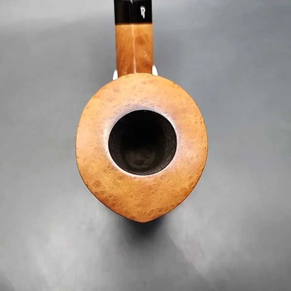 Rinaldo’s Fiammata series comprises of some of the workshop’s highest-grade offerings, as is common practice in Italian pipe-making. This particular Rinaldo is a Fiammata Mediterranea grade, meaning it is, per Rinaldo themselves, a smooth straight grain with partial rustication. The straight grain is clearly evident, being tightly-wedded and consistently aligned all around its bowl, while the partial rustication hides just below, on the pipe’s underside.