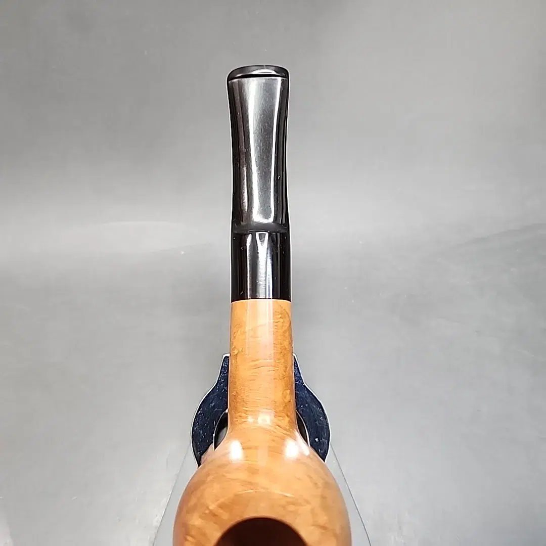 I don’t see anything wrong with this one myself. I could be incorrect about its manufacture, perhaps. It’s a nice, simple bent billiard in a light, natural stain, which accentuates a nice patch of bird’s-eye grain on its right flank.
