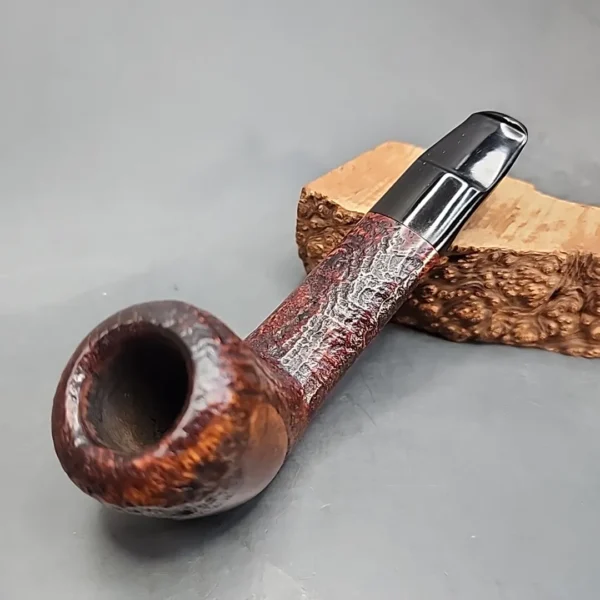 This 989 from Royal Danish is the make’s version of Stanwell’s shape 89, with the first ‘9’ indicating that it is a Royal Danish pipe. The shape itself is a rather iconic one in Stanwell’s catalog, having been designed by father of Danish style pipe-making Sixten Ivarsson. It is something of a Danish take on the traditional English-French pear shape, with a bowl that widens slightly as towards its convex rim along with an an oval shank and trapezoidal, ebonite stem. This Royal Danish version is partially sandblasted, with panels of smooth briar arranged around the bowl.