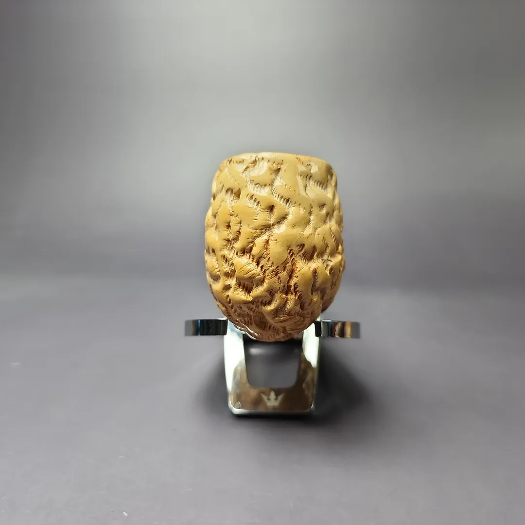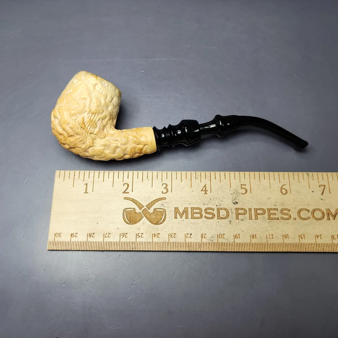 Unfortunately the nomenclature and/or logos from this pipe have worn off, though it does remind me quite a lot of the old Pioneer meerschaums made for Wally Frank. Just like those meerschaums, this one features a kind of army mount stem configuration, which many find to be an improvement on the usual two-piece nylon threaded fitments. The rustication is nicely applied, too, giving off a kind of wicker basket aesthetic.