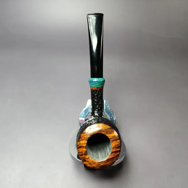 In the early 2000s, Tom Eltang wanted a way to offer pipes that were as meticulously crafted as the ones he ordinarily makes, but at a price point more accessible to the average pipe smoker. To this end, he created Sara Eltang pipes, named after his daughter. While Tom Eltang pipes are made solely by Tom himself, Sara Eltang pipes are made collaboratively by Tom and his proteges, such as Mike Sebastian Bay, in the former’s Copenhagen workshop. Sara Eltang pipes are also made in a set number of shapes, with hand cut acrylic stems, rather than ebonite. As Tom and his proteges are usually very busy making their own-name pipes, Sara Eltang pipes are not produced regularly, but are instead made in batches every few years. This one is a classic Danish Dublin, dressed in a crisp, partial sandblast and bearing a jade-colored ferrule. As Tom Eltang and Sara Eltang pipes tend to be, it is very lightweight, making for an easy clencher.