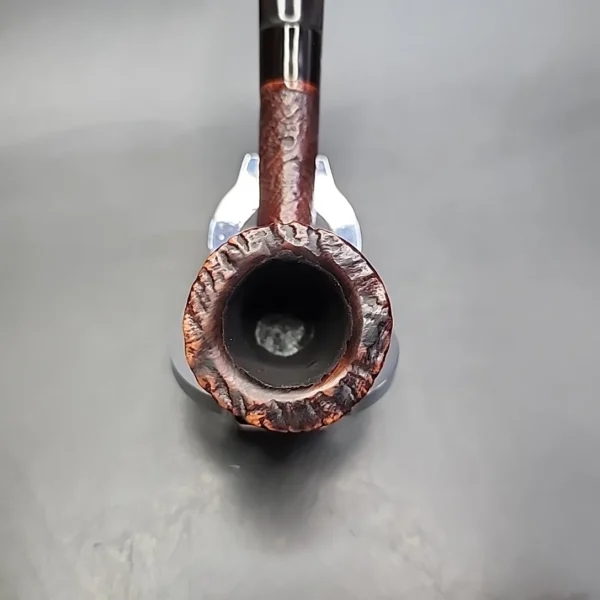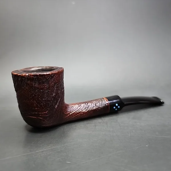 This particular Sasieni is from the make’s renowned 4 Dot series. It’s a classic, quarter- bent Dublin shape, dressed in Sasieni’s Ruff Root (sandblast) Dark (burgundy stain) finish. Reserved, elegant, lightweight.