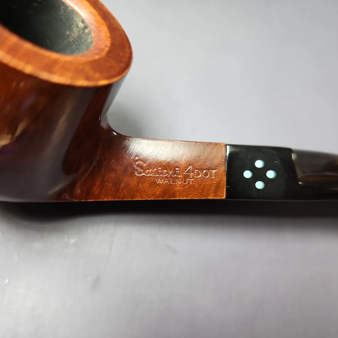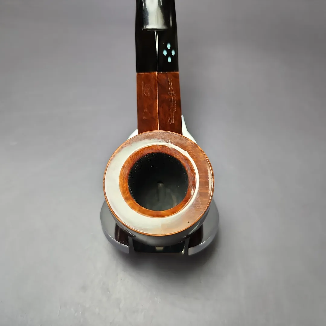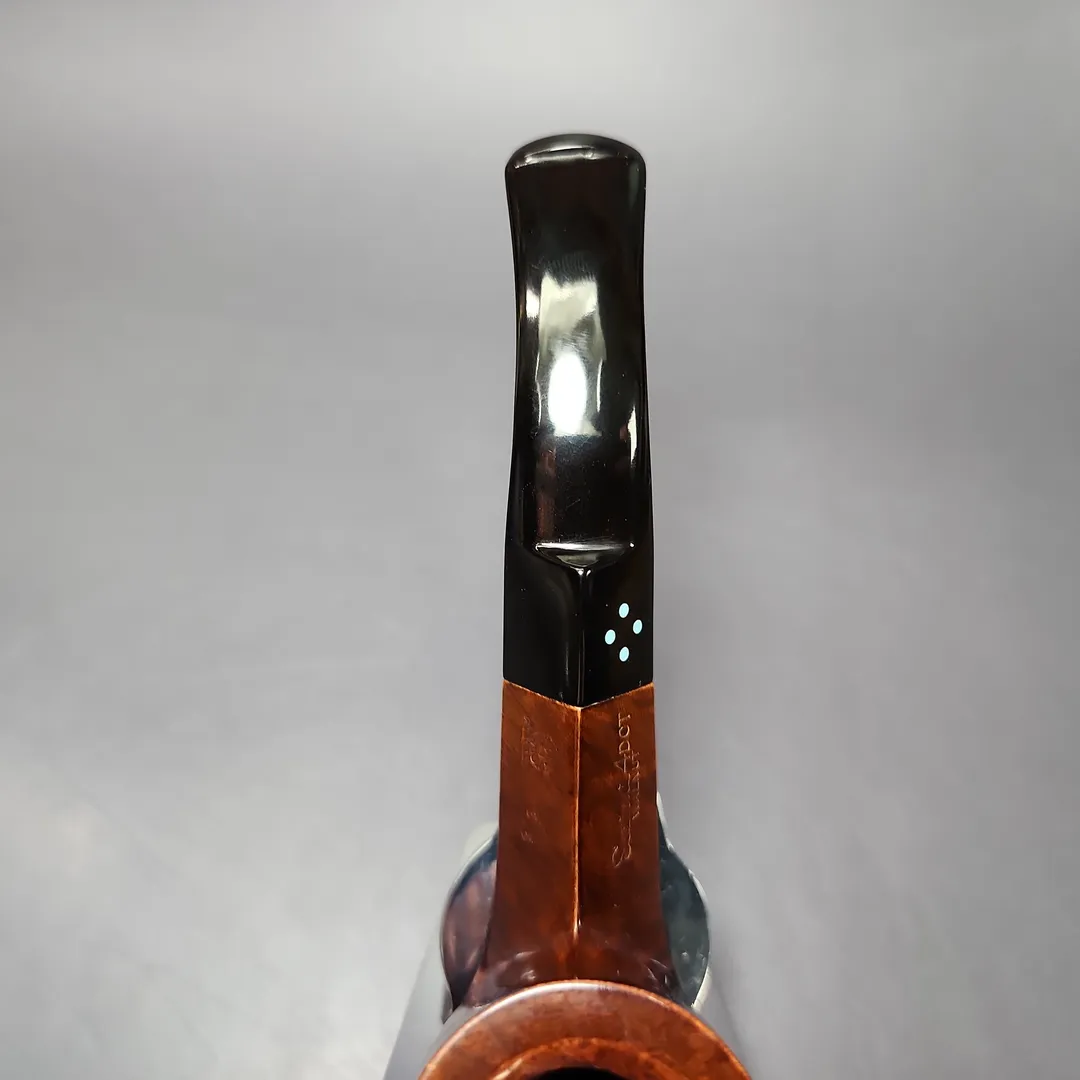 After a legal battle with Dunhill prevented Sasieni from using a one-dot stem inlay, Joel Sasieni was forced to come up with a new way of marking the company’s most perfect pipes. So, Sasieni started using four-dot inlays instead. Thus was born the Four Dot, which, funnily enough, came to rival even Dunhill’s “White Spot” as a signifier for high-grade, English-made pipes. Decades later, after the Sasieni family sold the company, the Four Dot was reborn as the 4 Dot, as seen here (and as it remains to this day). This 4 Dot a nice bent pot shape, with a diamond shank, a beveled rim, and an auburn finish, evoking the mid-century golden age of British pipe design.