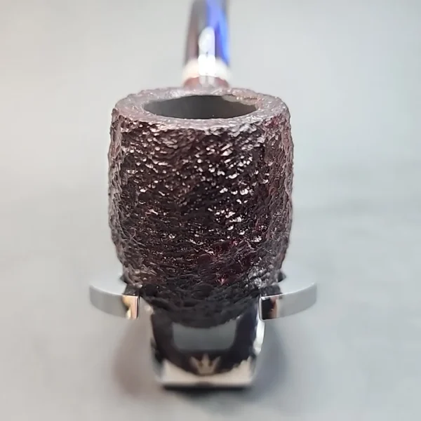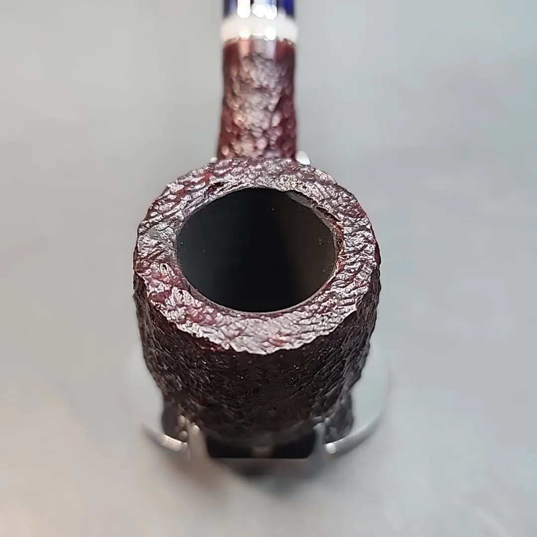 A festive presentation fit for the season, the 2023 edition of the Saint Nicholas series elevates a range of Savinelli’s most popular shapes with a dark burgundy stain, concise rustication, and a mouthpiece of deep blue acrylic. A complex accent of nickel and white acrylic completes the aesthetic, echoing the look of snow and tinsel. The finish is available here in Savinelli’s 606 KS bent Billiard.