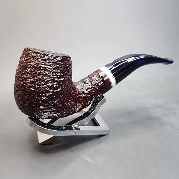A festive presentation fit for the season, the 2023 edition of the Saint Nicholas series elevates a range of Savinelli’s most popular shapes with a dark burgundy stain, concise rustication, and a mouthpiece of deep blue acrylic. A complex accent of nickel and white acrylic completes the aesthetic, echoing the look of snow and tinsel. The finish is available here in Savinelli’s 616 KS bent Billiard.