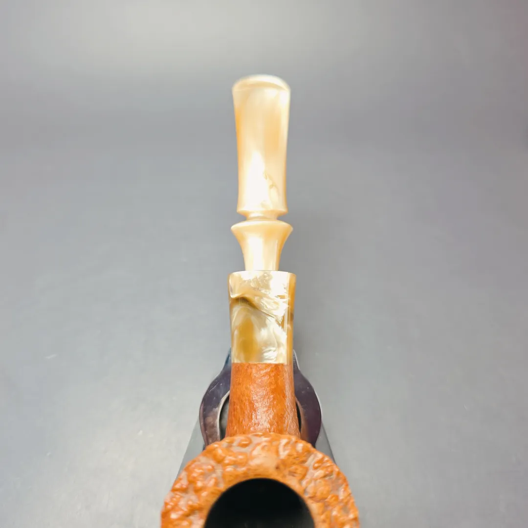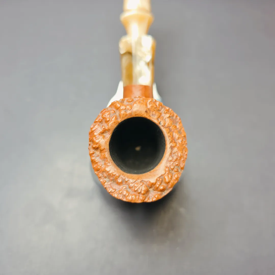 There are two Savinelli lines from decades past that have become particularly sought after today, despite being rather short-lived at the time. There was the Estella, a rather rugged line of freehand pipes with colorful Lucite mouthpieces; and there was the Nonpareil, comprised of large, non-standard shapes, with horn ferrules and flared, Danish-style mouthpieces. There were reissues, which were similarly short-lived, and there was even a crossover line: the Estella Non Pareil, which featured bowls and Lucite mouthpieces resembling those of the Estella, but which were also mounted with that same Lucite, and had mouthpieces cut in the same, Danish style as the Nonpareil. The reason I mention this is because, when this pipe first landed on my desk, I thought it might be an Estella Non Pareil. But, no, it’s an Autograph, funnily enough, albeit one a little different to most from the latter series. The Autograph series itself comprises some of Savinelli’s most high-end pipes. Like the Charatan freehand workshop in mid-20th century England, or Tsuge’s Ikebana workshop in late 20th century and 21st century Japan, Savinelli has its own, special area of the company’s campus reserved for master artisans, where non-standard pipe shapes are carved using techniques that are closer to handicraft than mechanized, mass production. In the case of this one, the workshop’s carver appears to have had the same soft spot for the Estella, the Nonpareil, and the Estella Non Pareil that so many collectors do, with the result being something to surpass all three, arguably.