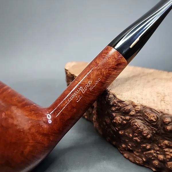 Savinelli’s De Luxe Milano is a fairly old line, and one that isn’t produced anymore, which is a shame. While newer Savinelli’s tend to be more colorful or elaborate in their finishes, the De Luxe Milano series offered simple, traditional aesthetics combined with Savinelli’s Italian-style English-French shapes. In this example, the finish is a warm brown-blonde stain, highlighting some beautiful cross-grain patterns, paired with a jet black vulcanite stem (something Savinelli, in recent years, has used infrequently, preferring acrylic).