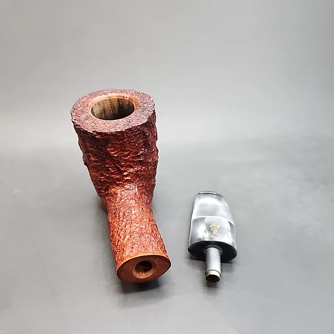 This Savinelli comes from the brand’s short-lived Estella line. I’m not sure why Savinelli discontinued it – perhaps the pipes were just not selling well enough at the time – but the pipes soon became a cult favorite among collectors and smokers. We don’t get too many of them here, but when we do, they’re in and out of the door pretty quickly. They tend to be on the large side, as with this one, and the rustication is very rugged, even when compared to other Italian approaches. This Estella is a nice cinnabar red, not unlike Castello’s Old Sea Rock, but rather than being fumed, the bowl is lightly contrast stained. I’d say the color works really well with the smoky grey lucite stem.