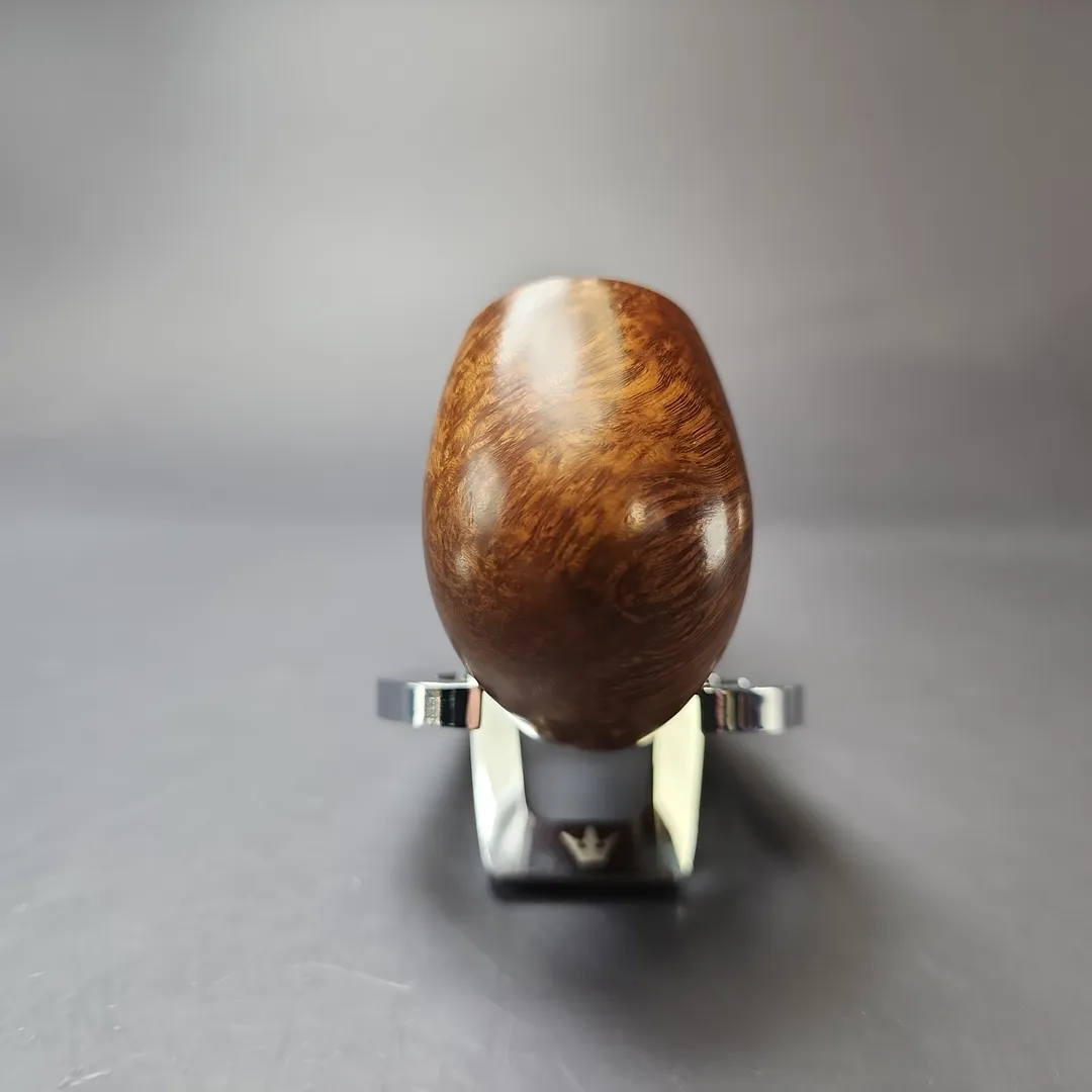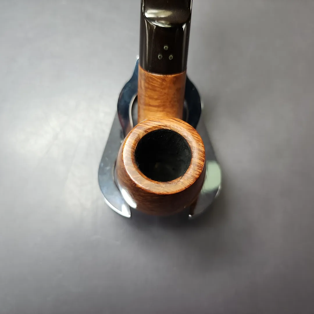 Savinelli’s Guibileo d’Oro (English: “golden jubilee”) pipes are the pinnacle of its output as far as traditional shapes are concerned. For any given year, just 0.1% of the already high-quality briar blocks that Savinelli acquires will be of the standard required for its Guibileo d’Oro grade pipes. For comparison, 1.2% of these blocks will qualify for Savinelli’s other traditional high-grade line, the Punto Oro. In other words, the Guibileo d’Oro is more than 10 times as uncommon as the Punto Oro within Savinelli’s output. This one is rendered in Savinelli’s shape 613 Oom Paul, the company’s less common, slightly more compact sister shape to their standard 614. It’s very beautifully carved, as one would expect, with the bowl’s plump sides alive with a healthy amount of bird’s-eye.