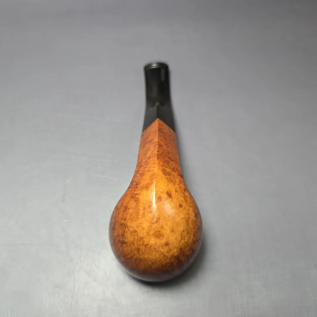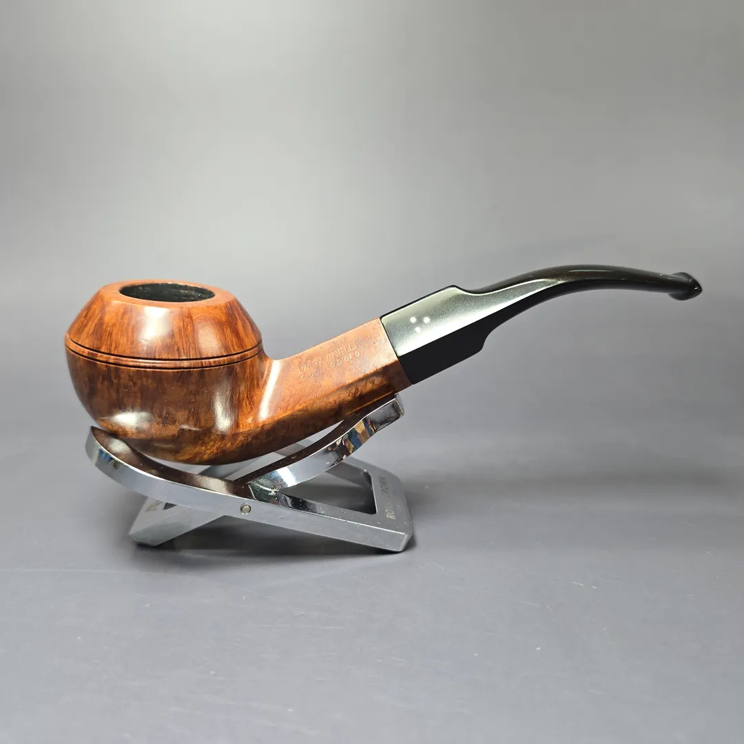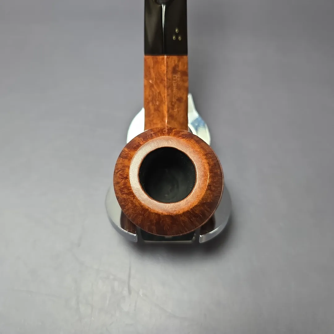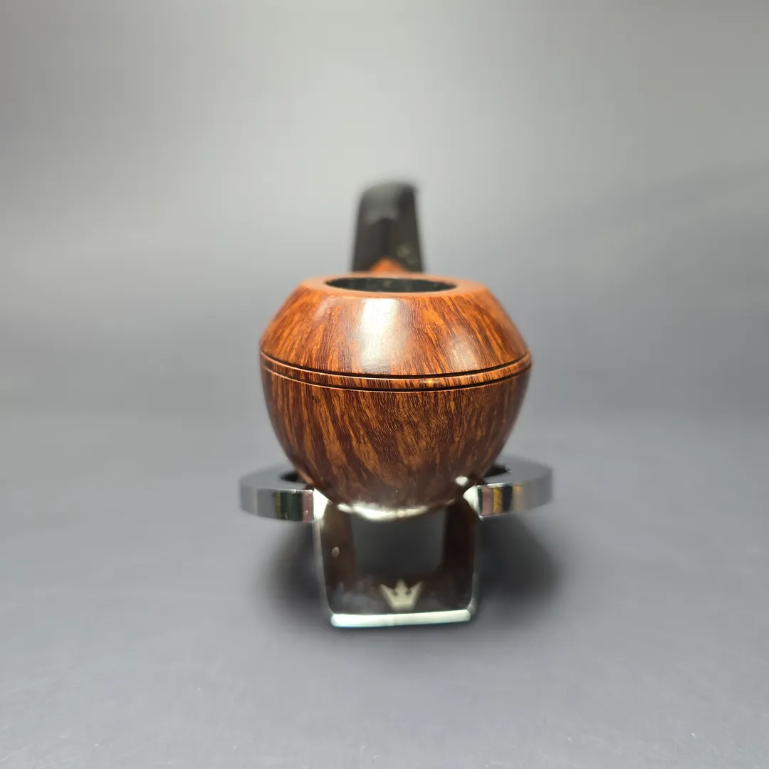 The Giubileo D’Oro, sometimes simplified as the Giubileo Oro, is the highest grade awarded to Savinelli’s non-freehand pipes. While the make’s famed Punto Oro pipes are of such a high standard that only around 1% of stummels turned annually qualify for a Punto Oro grade, fewer still have what it takes to be a Giubileo D’Oro. In fact, of the thousands and thousands of stummels turned at Savinelli’s Milan campus each year, only roughly 0.005% of them possess the exceptional, flawless briar and superior graining to be rewarded with the Giubileo’s signature three gold dots. This one is rendered in the quite uncommon “623” bulldog shape, and looks to be a slightly older Giubileo iteration, judging by its unfiltered, ebonite stem (rather than the 6mm or 9mm acrylic stems that are standard on Savinelli pipes today). True to its name, the pipe features excellent flame grain running the circumference of its bowl, and a long strip of bird’s-eye on its undeside.