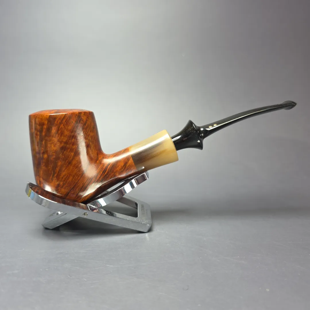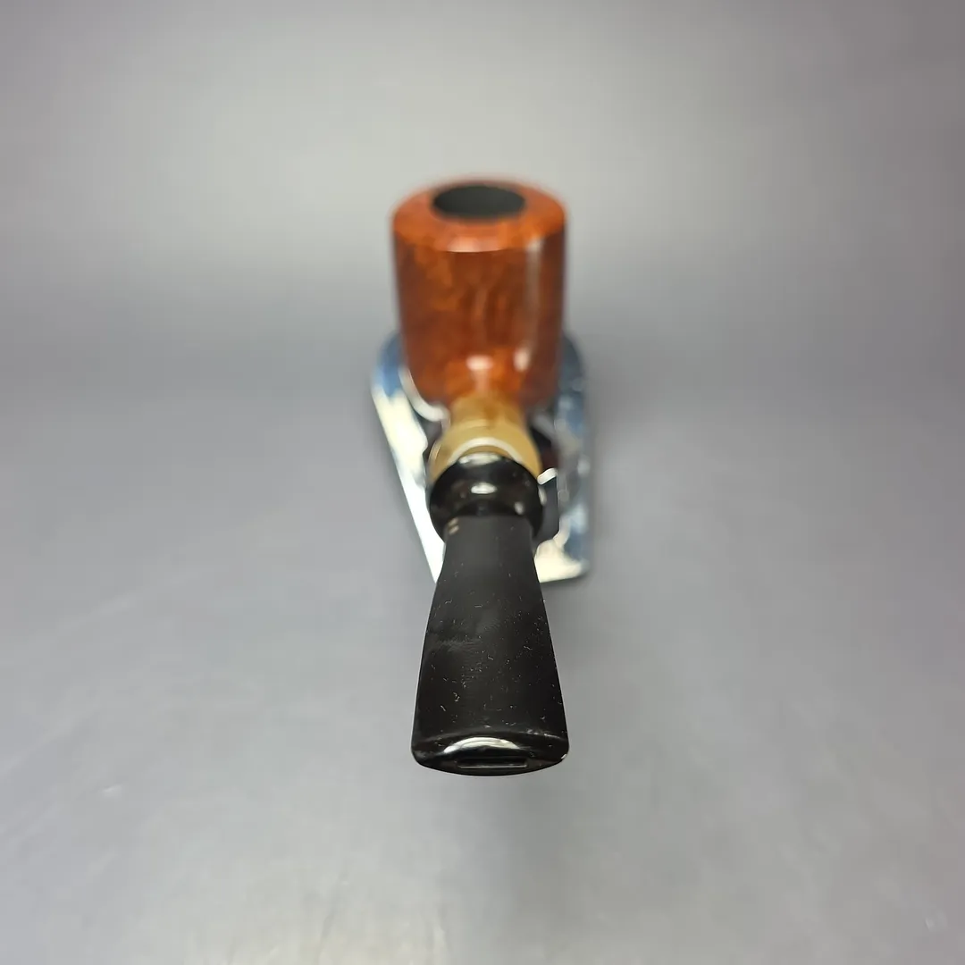 Taking its name from an archaic term for “without equal,” Savinelli’s Nonpareil was one of its top-of-the-line series from the mid- to late-20th century. These pipes were distinguished by their exceptional grain, horn (or imitation horn) ferrules, and flared ebonite stems, along with two gold dots on the latter. Like the Estella and Punto Oro Corallo, Savinelli’s Nonpareil series has become a cult-favorite over the years but, unfortunately, it also shows no signs of returning. This one is a very unusual shape, even amidst the already quite unorthodox stylings of the Nonpareil range, with a convex rim and a slight protrusion at the base of the bowl. Combined with the pipe’s horn ferrule and flared ebonite stem, I am reminded—albeit just a little—of the famous Bo Nordh pot, or Bo Pot, found in Scandinavian pipe making, though I very much doubt that was the intention.