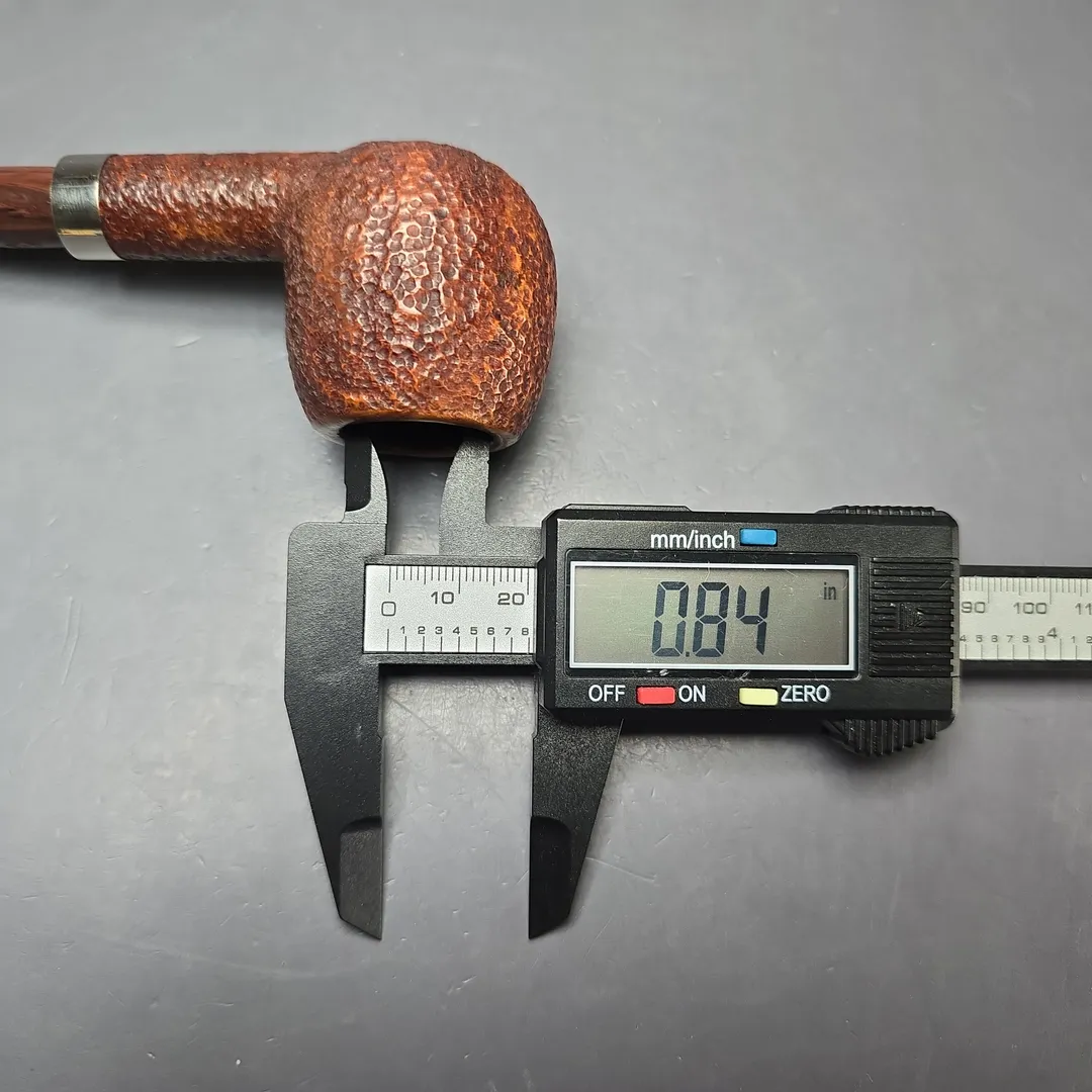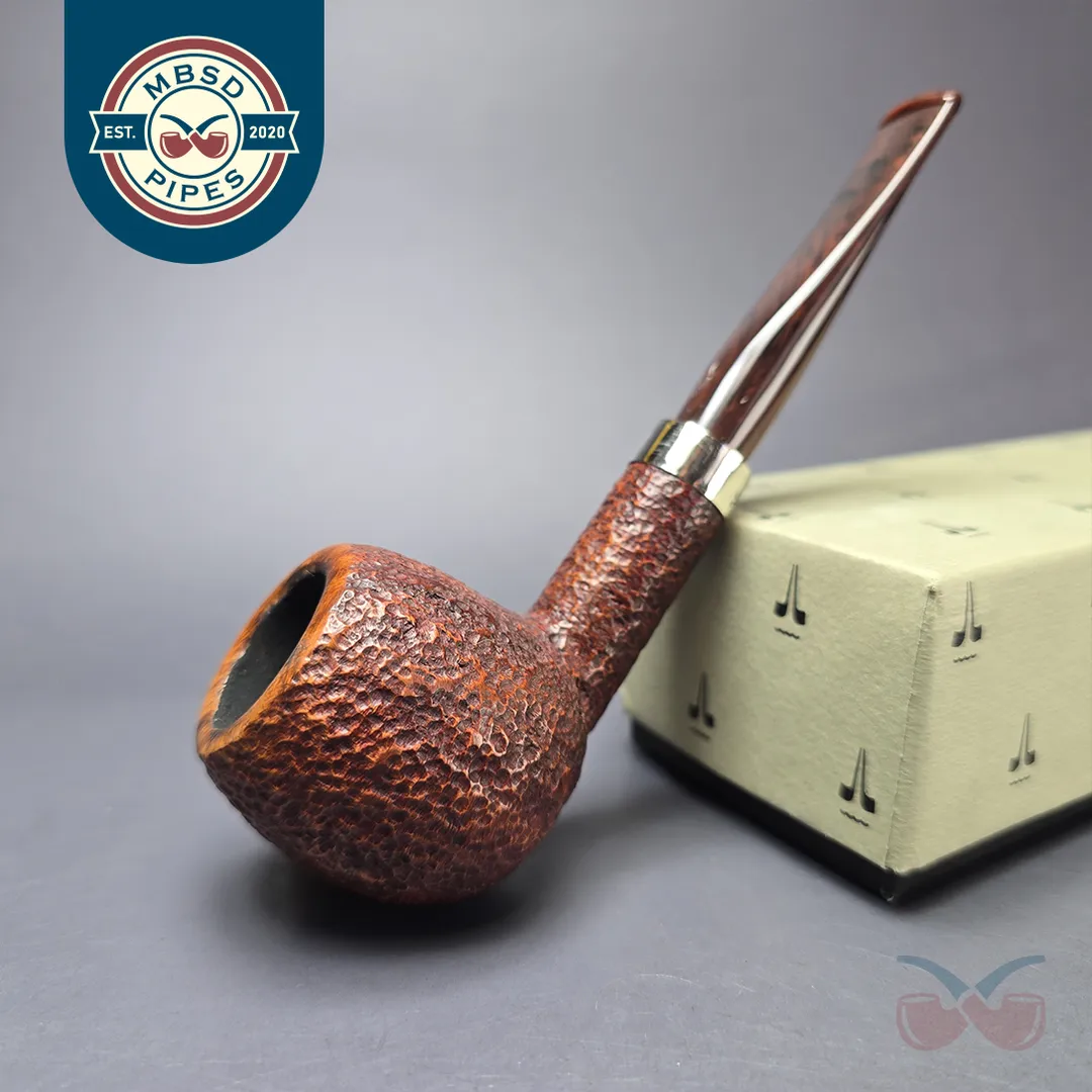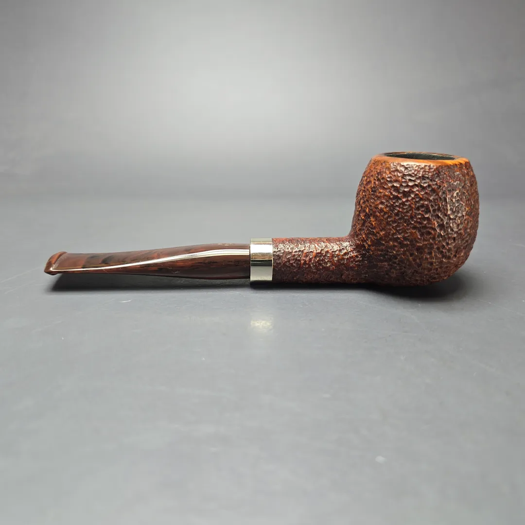 Not to be confused with the Marco Polo, the Polo was a line of Savinelli pipes made long ago, and which has been out of production for a similarly long amount of time. There were smooth Polos, and there were rusticated Polos, as seen here, with the connecting theme being a dark, reddish brown finish, a cumberland-style acrylic stem, and a neat silver collar at the shank end. This one’s a classic lightweight apple, making it an easy, good looking clencher.