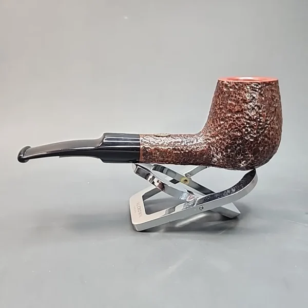 It was produced in the 90’s. This series was created to introduce three new models: 144, 344, 644. Five are the variants: “A” natural color and beautiful flame, “B” natural color, “C” dark brown, “D” light rusticated, “E” dark rusticated. A silver little shield on the shank beautifies the pipe. Here we propose a particular model: 144 KS which is an half-bent Brandy. Solid and spacious, it has a saddle stem that receives elegantly the slight bending.