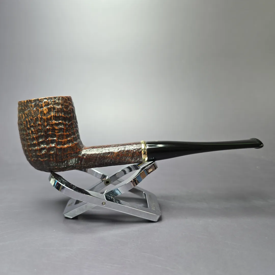 When Savinelli opened its Milan workshop in 1948, the first pipes made there carried the “Punto Oro,” or “gold point.” Like Dunhill and Sasieni before them, Savinelli pipes thus featured a dot inlay on the top of the stem to distinguish them as high quality smoking instruments. Over the subsequent decades, and with the release of numerous new Savinelli lines, the Punto Oro (and with it the Giubileo D’Oro) became a designation for some of Savinelli’s highest grade pipes, with only around 1% of Savinelli’s entire output earning this qualification. In even more rare situations, however, Punto Oro pipes may be given extra adornments. Judging by the consistency of the ring grain in its sandblast finish, I’d imagine this was why it earned an additional, solid gold collar, which even Punto Oro and Guibileo D’Oro pipes are seldom bestowed.