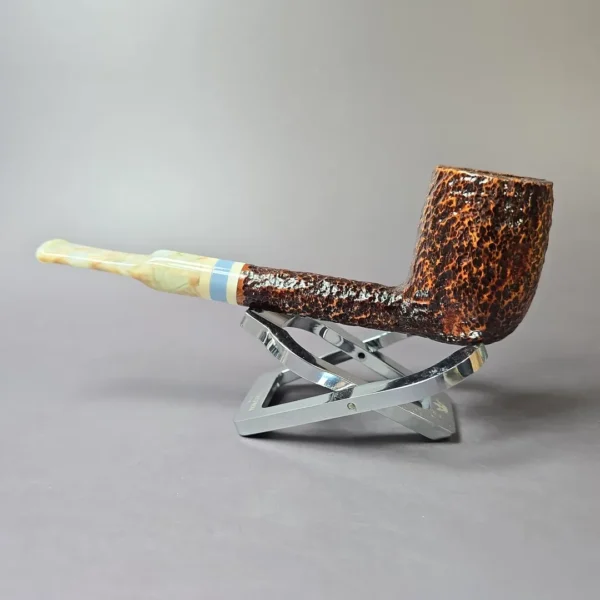 The Sasso is one of a number of new lines released by Savinelli this year, all of which have really impressed me. The Sasso might be my favorite, and indeed might be my favorite Savinelli release since the Miele, which I adore. Coming from the Italian word for “stone,” the Sasso is distinguished by its marbled acrylic stem, as well as a collar formed by off-white and light blue acrylic bands. It’s colorful, but very tasteful. This Sasso is a classic and incredibly lightweight Lovat shape, with a weathered brown rustication that contrasts beautifully with the hues of its accents and stem.