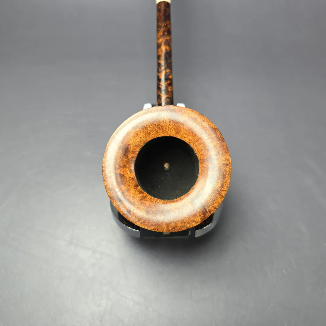 It’s funny, when this pipe first landed on my desk, I was struck by its resemblance to a very specific shape from decades past: Charatan’s 148, also known as the Outsize Pot. With its wide, squat bowl and similarly broad chamber, and its beveled rim, a good part of this Scottie is a dead ringer for a Charatan. The difference, of course, is that Piersel’s pot perches on the end of a pencil-thin shank and stem that pushes past the 7 inch mark. But what’s funny is that Reuben Charatan himself was greatly inspired by clay pipes, in much the same way as Piersel is. The famous Newmarket and Dresden shapes conceived by Reuben in the early 20th century were, after all, explicitly modeled on old clay pipe designs, with adjustments made to better suit contemporaneous tastes and briar as a medium. With this Scottie, we find something similar, though in a hybrid form far beyond even what Reuben could have conceived. Historical precedents aside, the pipe itself is classic “Scottie,” with its squat pot bowl dressed in a rich, ring grain “Relief Contrast” blast that proceeds up its narrow shank. The pipe’s ebonite stem is vibrant, as is also Piersel’s style, though in a shade that still complements that of the bowl, and whose juxtaposition is softened by an accent of pearly-white Juma.