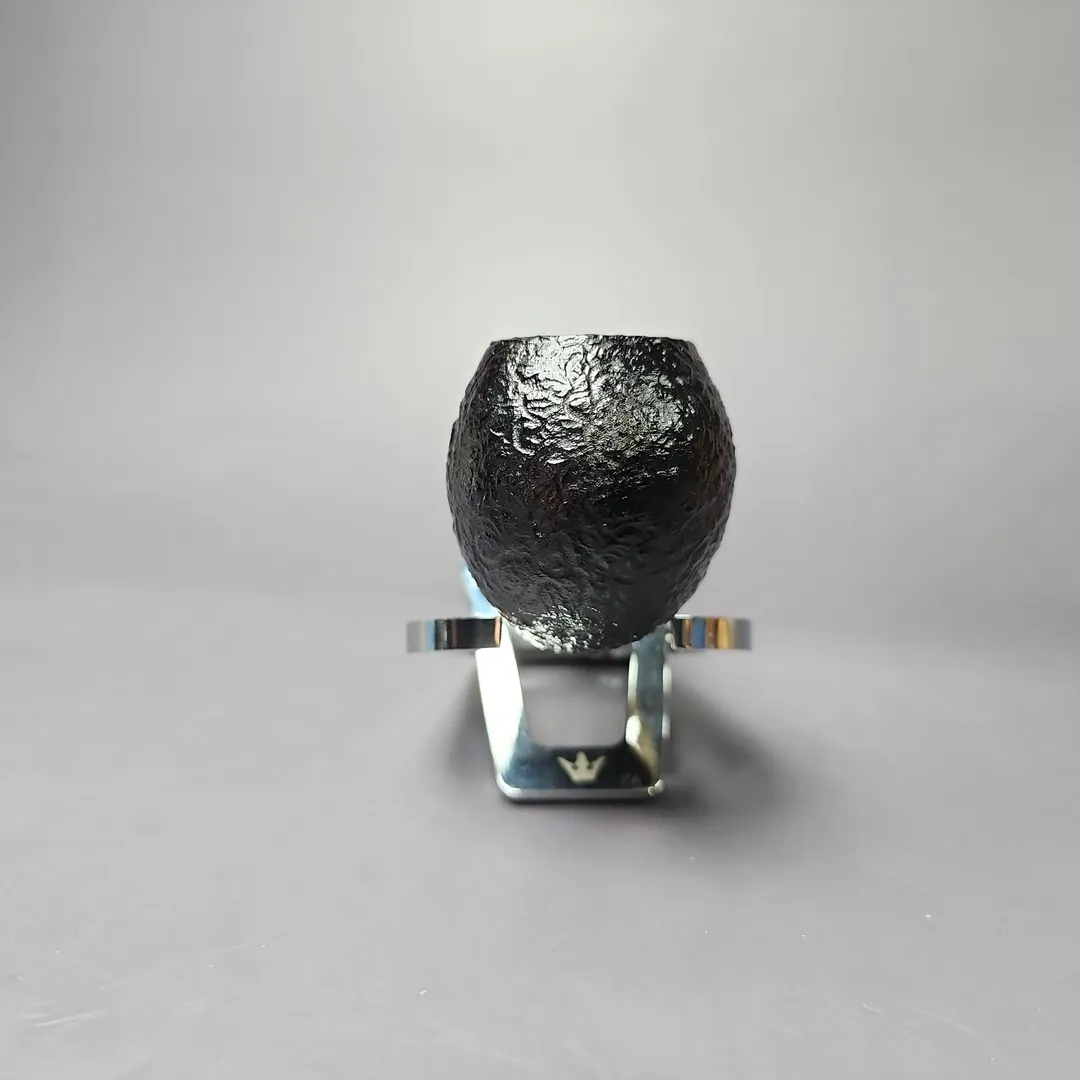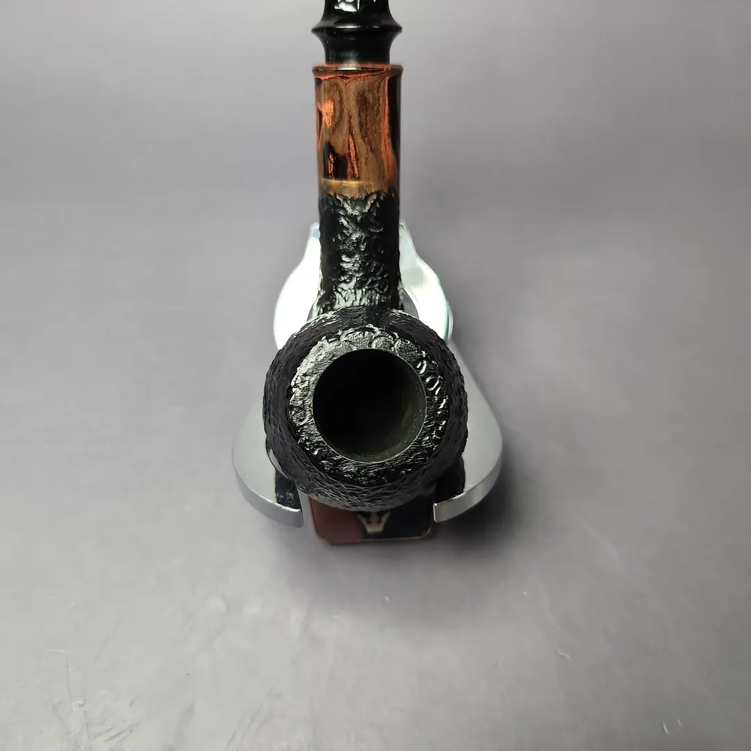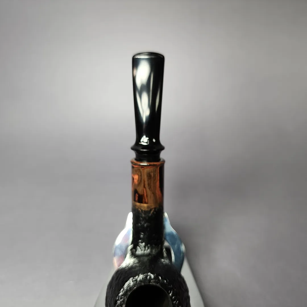 This week we’ve got two fittingly “spooky” Reum pipes in just in time for the Halloween season. This is the second, a distinctive re-envisioning of the Danish apple shape, as popularized by figures such as Erik Nording, Hans Former Nielsen, and Jens Tao Nielsen. Managing to be both slight and slender and perfectly plump, Reum’s rendition wears a rather gothic black sandblast which, alongside the pipe’s flared black ebonite stem, is offset by a ferrule cut from orange cumberland.