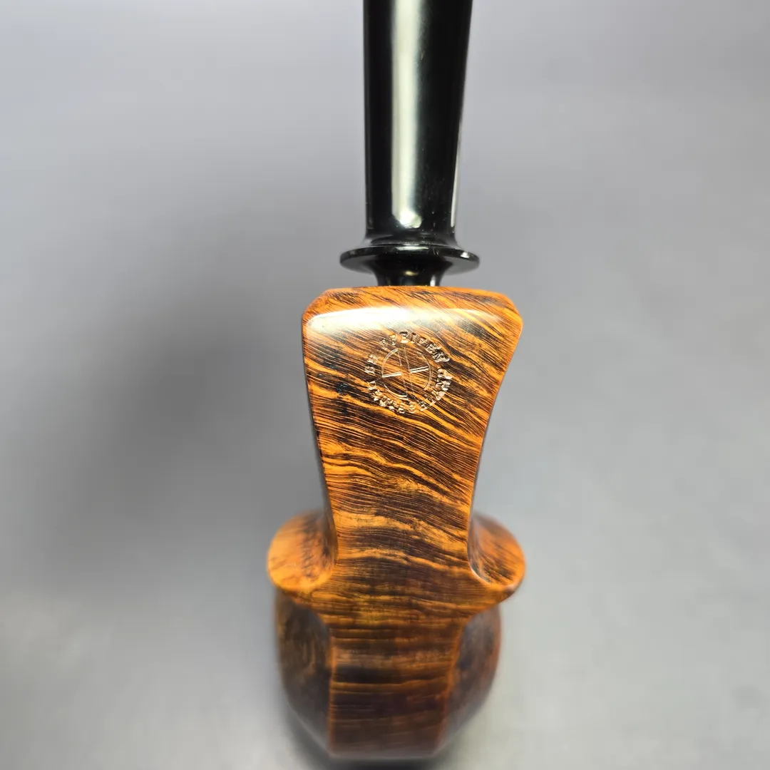 As I like to say, there are even more species of blowfish in pipes as there are species of blowfish in the ocean—and there are a lot of them down there. This one from Sebastian Heck is a rather uncommon of a blowfish sitter, in addition to several other key features. Eschewing the plumpness of the style inaugurated by Lars Ivarsson, it instead plays with facets, panels, furls, and asymmetries and weaves them into a design that is equal parts aquatic life and architecture. As a final touch, and as a reminder of its natural roots, a dash of plateaux burl has been left, quietly erupting on the bowl’s left flank.