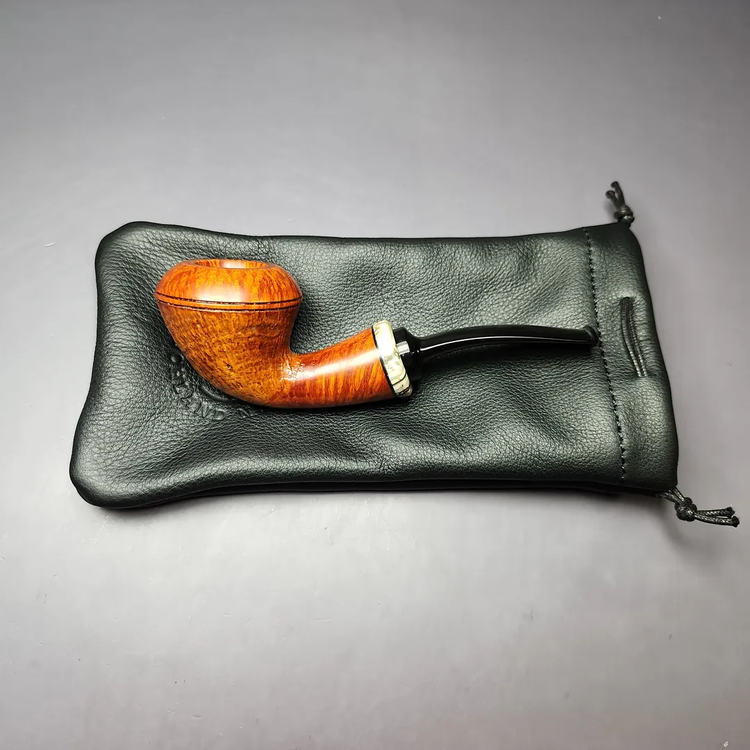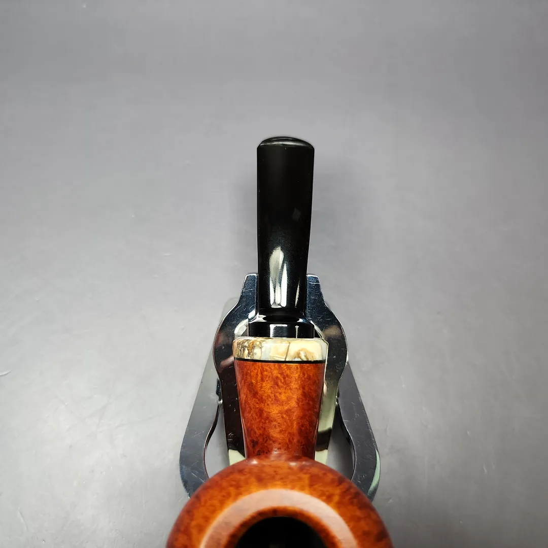 One of the pipes that first drew me to the work of Sebastian Heck was a Rhodesian he’d made, which I soon learned was a shape he periodically returned to. Heck’s approach to the Rhodesian is an interesting one, leaning slightly toward certain Danish renditions, but more so to those of 21st century American masters, such as Rad Davis or Don Marshall (a personal favorite of mine). This one is an excellent, mixed-finish version of the shape, with a crisp, ring grain sandblast around the bowl and smooth polished sections on its rim and shank. As with Heck’s Rhodesians that first caught my attention, this one features a beautiful shank accent cut from fossilized mammoth molar.