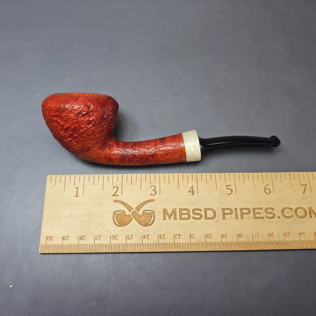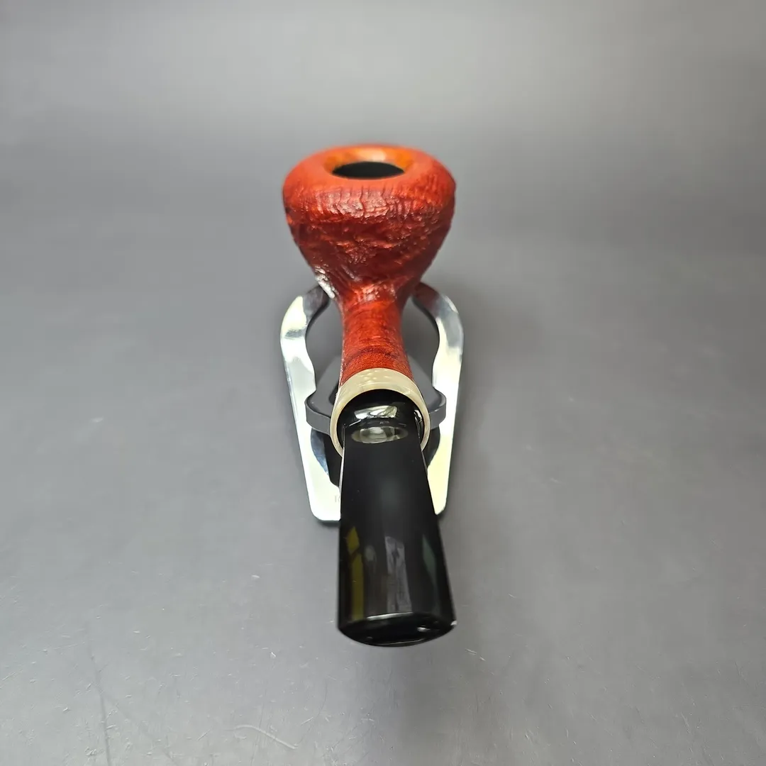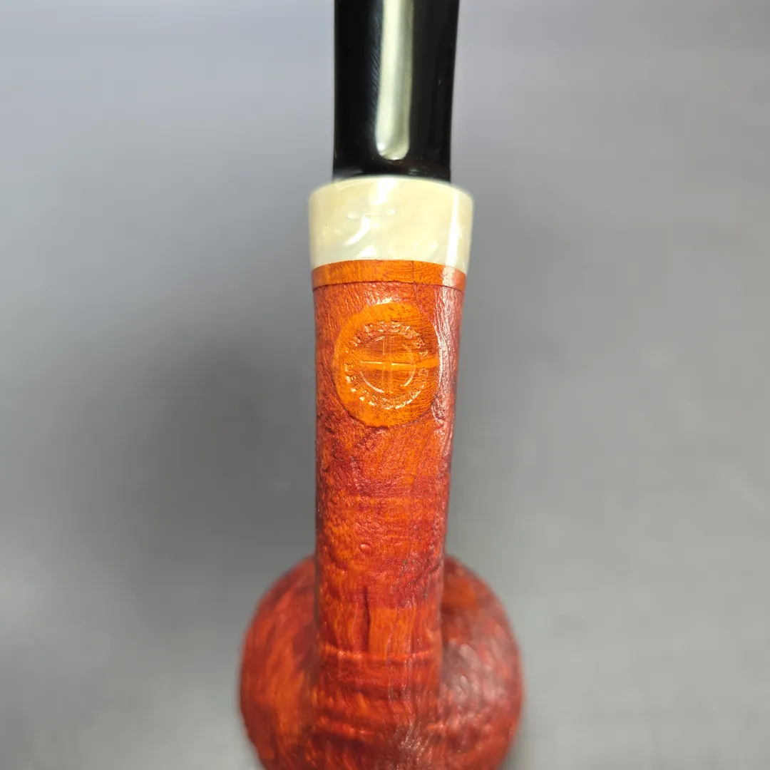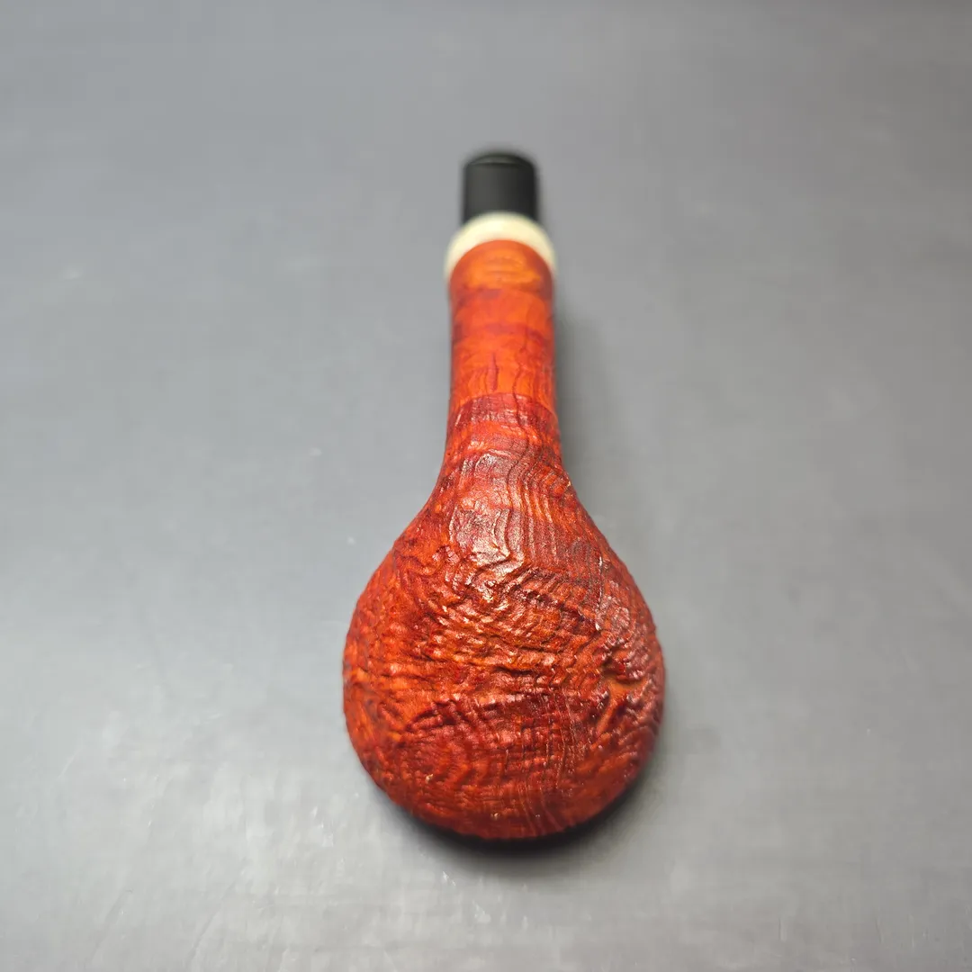 While not as common as tree heater briar, strawberry briar, or Arbutus Unedo, is nonetheless a staple material for artisan pipe making, in part because of its unique response to sandblasting. Being slightly softer than its sister root, even a light blast is enough to bring out strawberry briar’s deep grain patterns, as demonstrated by pipes from makers as diverse as Chris Morgan, Chris Askwith, and Federico Becker. Here we find Germany’s Sebastian Heck putting that same gnarly texturing to work in a very modern rendition of the Danish acorn. Dressed in a ripe red, slight contrast finish, the relief is almost lunar in look and feel, which juxtaposes nicely with the pipe’s clean-cut, ivory-like Juma accent and jet-black SEM ebonite stem.