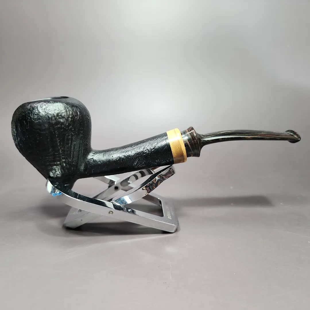After a very well received debut at MBSD, Sebastian Heck is back, and I couldn’t be more happy. For this pipe, Heck has channeled his inner Lars Ivarsson, putting his own twist on the Danish master’s signature long-shanked acorn shape. On the other hand, Heck’s choice of a light sandblast and a near-black stain, along with a fossilized mammoth accent and smoky ebonite stem, has the effect of creating something of a “Dress pipe” aesthetic, not unlike the one immortalized by Dunhill. Of course, neither Dunhill nor any of the other classic English makes ever offered anything quite like this before.