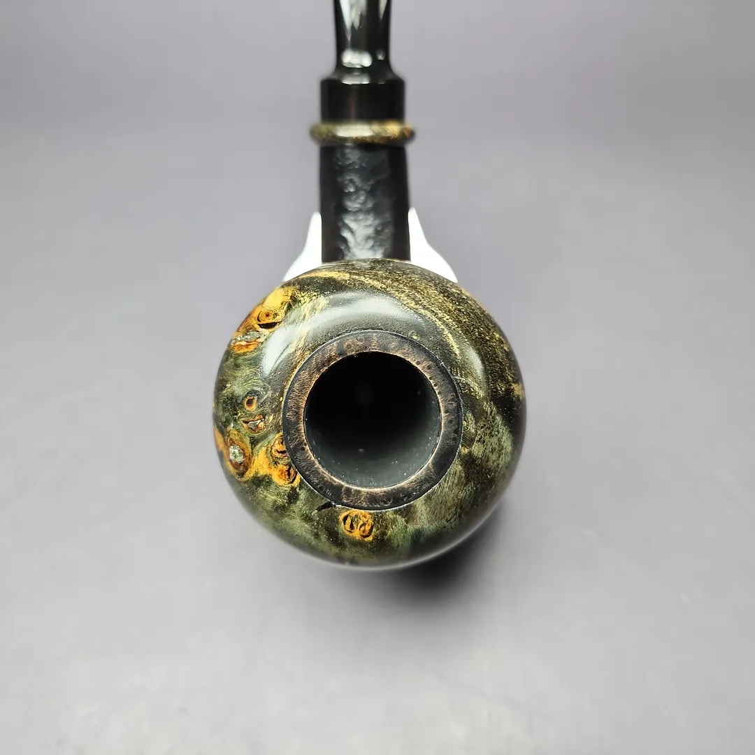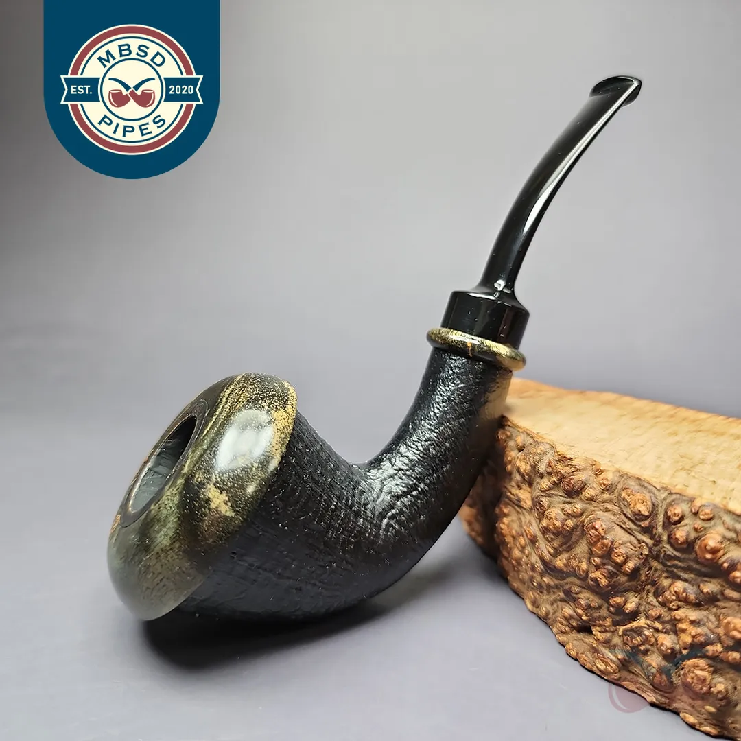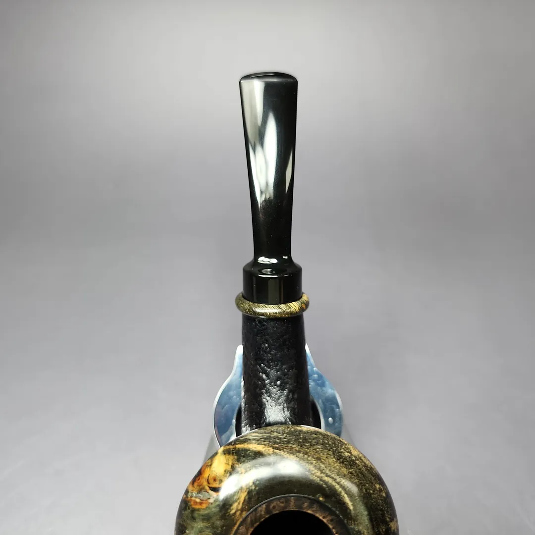 The calabash has seen a fascinating revival in the 21st century, and from artisan pipe-makers no less. From Tom Eltang, to J. Alan, to Mimmo Provenzano, pipe makers are putting their own spin on a shape older than the briar pipe itself. This rendition, from Germany’s Sebastian Heck, follows in that vein. Taking the form of a one-piece calabash, the pipe features a beautifully sandblasted, ring grain finish, with a reserved, near-black finish and black ebonite stem. Most distinctive about this rendition, however, is its “cap.” Instead of the more typical boxwood or beech that is often used to adorn modern artisan calabashes, this one features rings of stabilized around its rim and shank end, whose marble-like striations almost remind of fossilized mammoth tooth.
