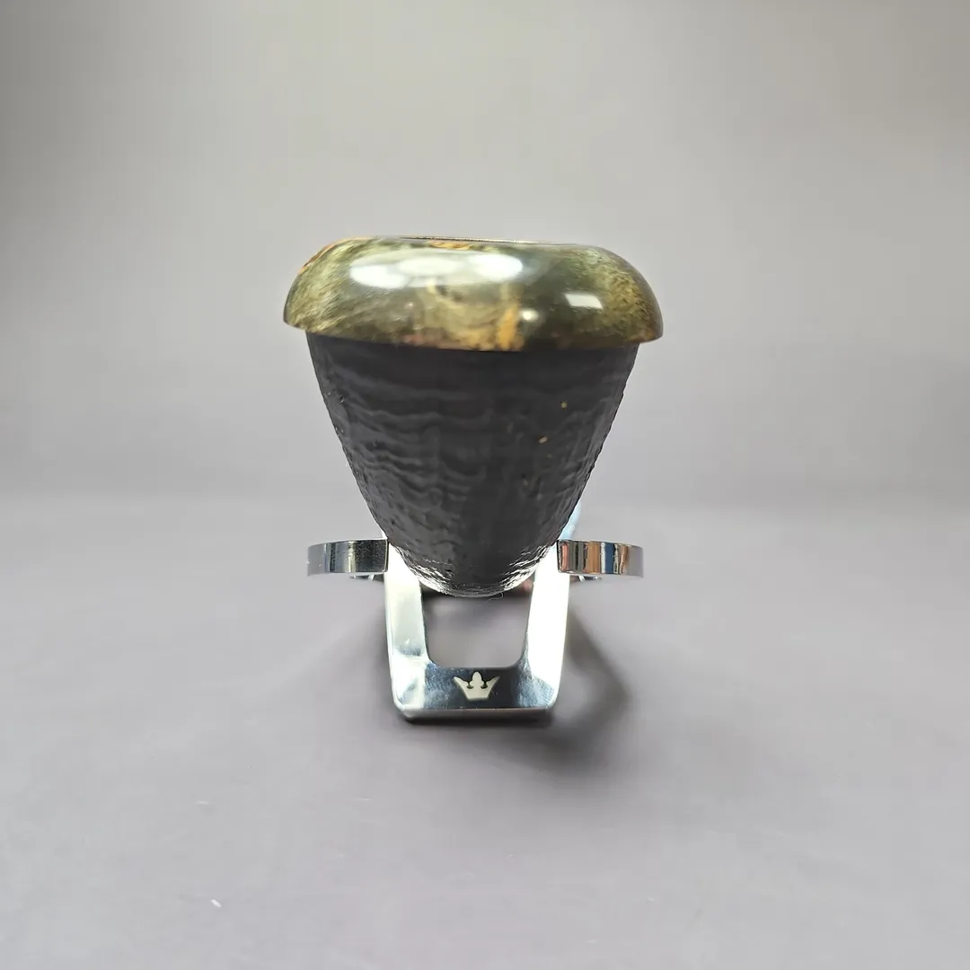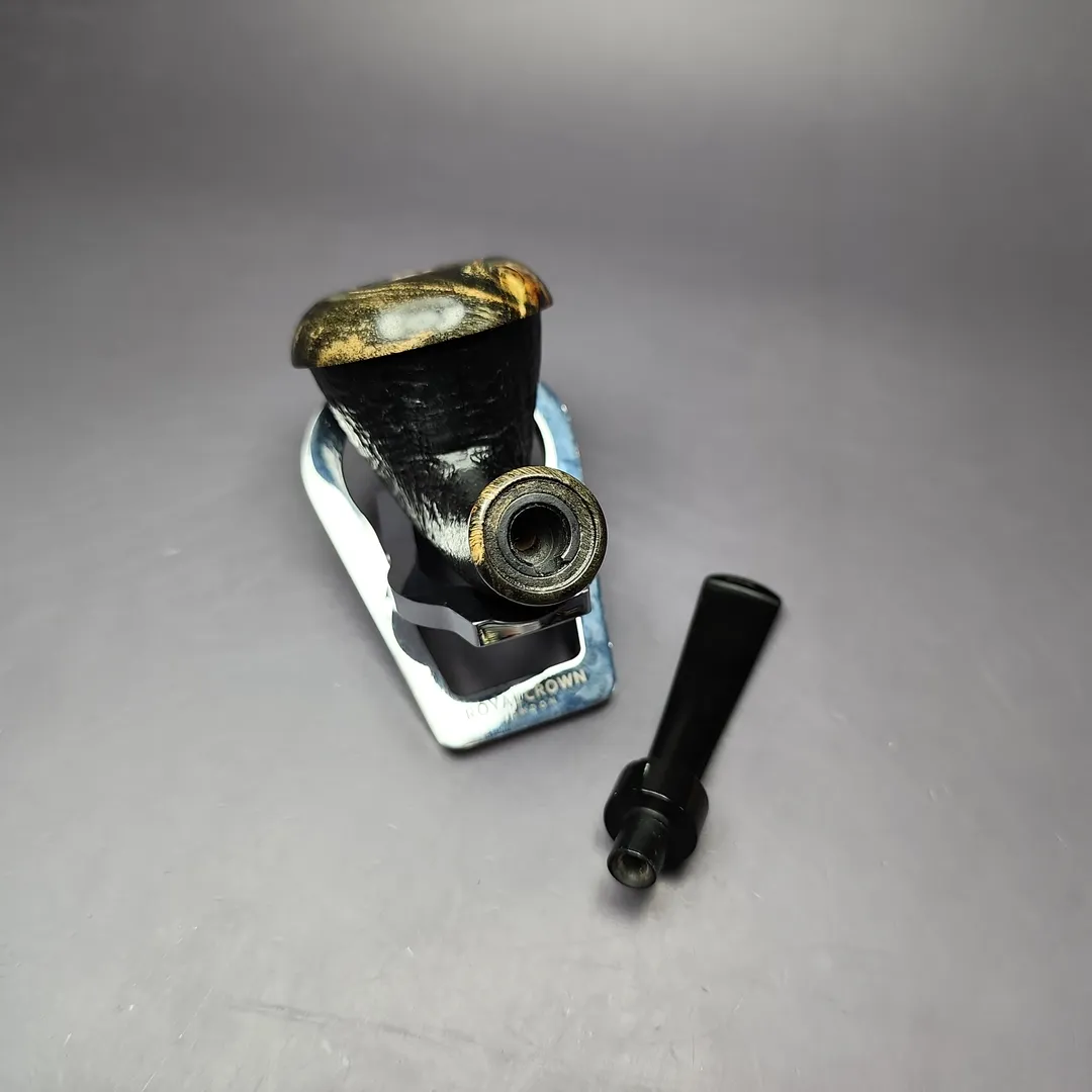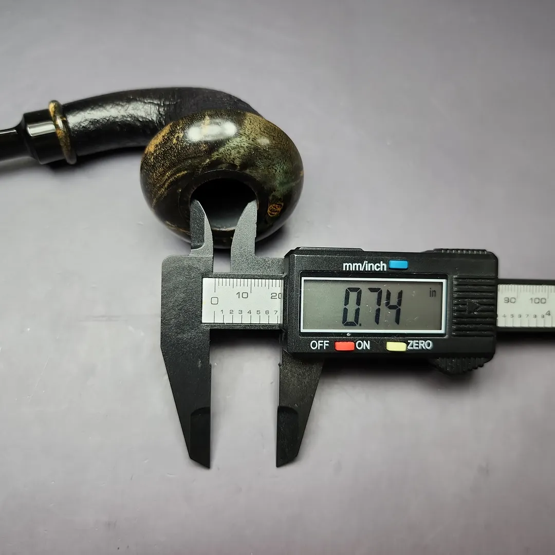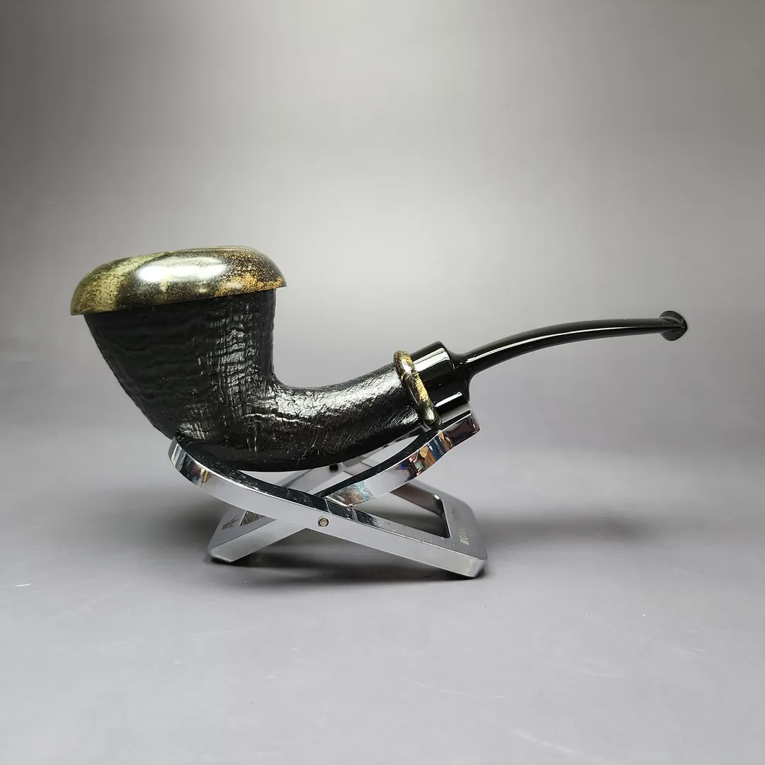 The calabash has seen a fascinating revival in the 21st century, and from artisan pipe-makers no less. From Tom Eltang, to J. Alan, to Mimmo Provenzano, pipe makers are putting their own spin on a shape older than the briar pipe itself. This rendition, from Germany’s Sebastian Heck, follows in that vein. Taking the form of a one-piece calabash, the pipe features a beautifully sandblasted, ring grain finish, with a reserved, near-black finish and black ebonite stem. Most distinctive about this rendition, however, is its “cap.” Instead of the more typical boxwood or beech that is often used to adorn modern artisan calabashes, this one features rings of stabilized around its rim and shank end, whose marble-like striations almost remind of fossilized mammoth tooth.