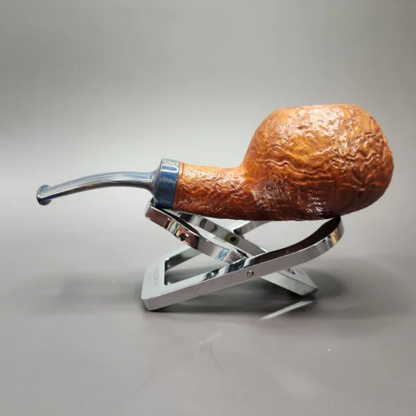 While the tomato has its origins in some of the earliest briar pipes, it was not until the post-war period that the shape—to paraphrase Nietzsche—became what it is. A departure from traditional factory methods toward a more flexible form of hand-shaping allowed the tomato to grow and fill out into the stout, squat, and slightly chubby artisan staple we know and love today. This one, from German artisan Sebastian Heck, is a little reminiscent of the renowned tomatoes of Jens Tao Nielsen, Roman “Doctor’s Pipes” Kovalev, or Clark Layton though its minimalism is perhaps best compared to the early squat shapes of Sixten Ivarsson and his apprentice Poul Hansen. On the other hand, Heck makes a clear departure from each of his forebears by way of a striking and highly enjoyable contrasting color scheme. Here Heck has paired a wonderfully craggy sandblast and a light, orange-brown stain with a stem hand cut from marine swirl German ebonite.